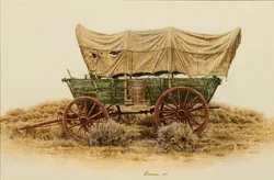 2018, LOT 168James BamaConestoga Wagon, Wyoming Centennial Ride 1990Oil on board12 x 18 inchesESTIMATE: $ 12,000 - $ 18,000