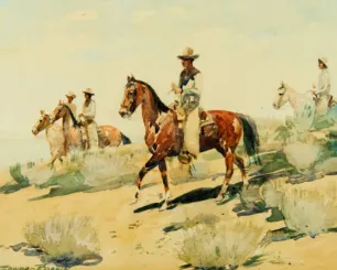 2025 - APRIL, LOT 318Edward BoreinFour Mounted CowboysWatercolor7 3/4 x 9 1/2 inchesSold for $38,025.00Including Buyers Premium
