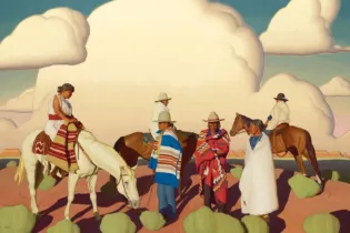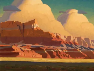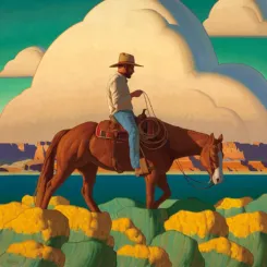 Logan Maxwell Hagege blends classical training with a distinctive modern voice, creating paintings that reinterpret the landscapes, figures, and atmosphere of the American West. His “stylized realism” merges geometric forms, softened edges, and carefully distilled colors to produce immersive, emotionally resonant scenes.