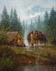 2018, LOT 175G. HarveyRocky Mountain CowhandsOil on canvas50 x 40 inchesSold for $ 198,900Including Buyers Premium