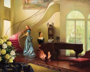 2022, LOT 431R. Brownell McGrewGirls Playing Piano and ViolinOil on board38 1/2 x 48 inchesSold for $2,340.00Including Buyers Premium