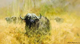 2025 - APRIL, LOT 441David ShepherdWater Buffalo in Tall GrassOil on canvas9 x 16 inchesSold for $12,870.00Including Buyers Premium