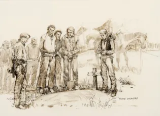 2024 - APRIL, LOT 002Russ VickersThe OutlawsOil on canvas24 x 36 inchesSold for $8,775.00Including Buyers Premium