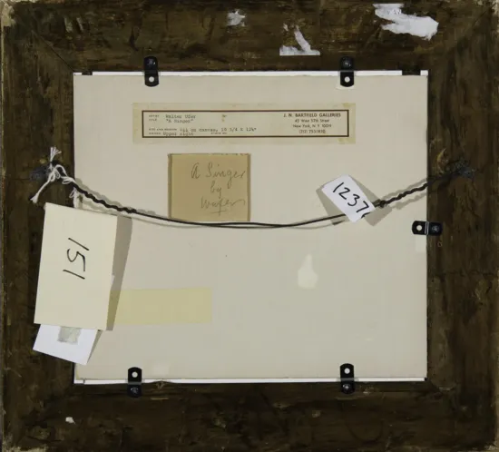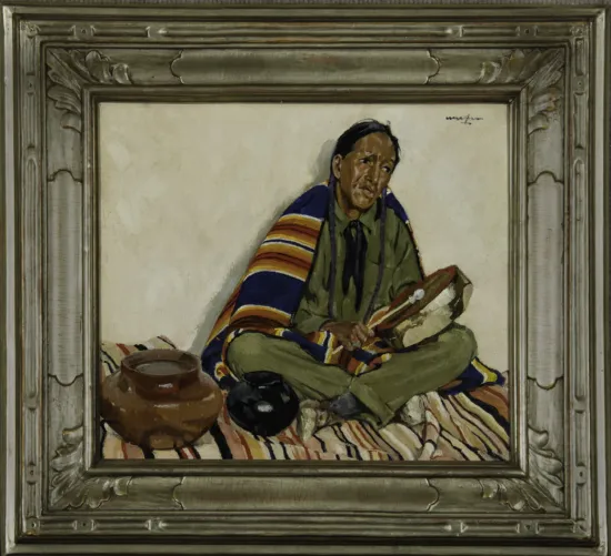 Like all the Taos Society of Artists members, Walter Ufer alternated fairly frequently between outdoor paintings with multiple subjects and more intimate indoor scenes with a single figure. Many of Ufer’s single figures are often holding drums or other instruments, as is the case here for A Singer. In Taos: A Painter’s Dream, Patricia Janis Broder writes, “Walter Ufer was both romantic poet and social critic, and his Taos paintings express his basic philosophy and outlook on life. He loved the beauty of the natural world and valued all forms of artistic creation. Above all, he was a humanitarian, a believer in the dignity and basic rights of the individual.”