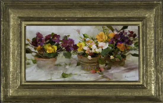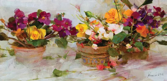 African Violets and Yellow Roses
