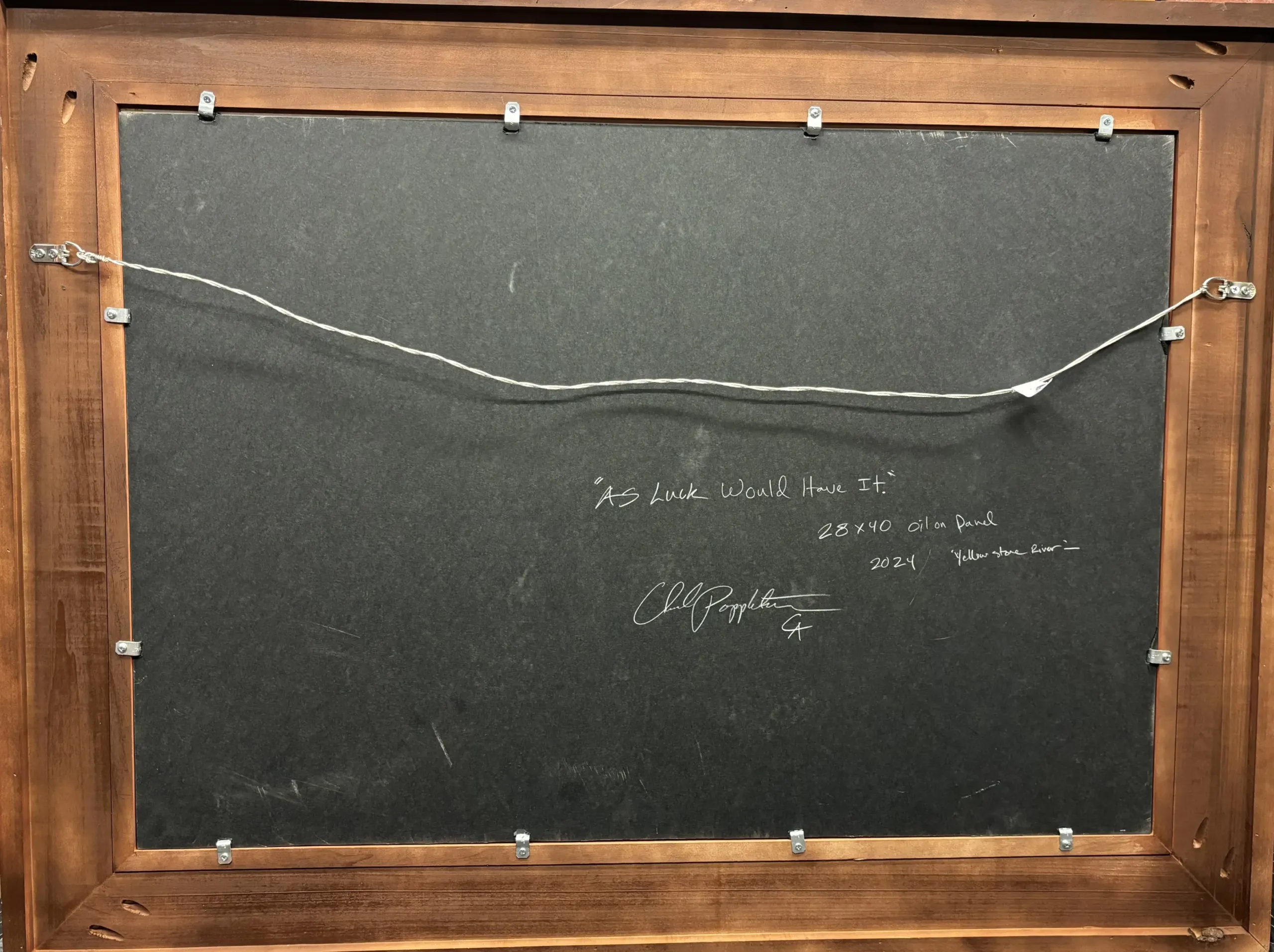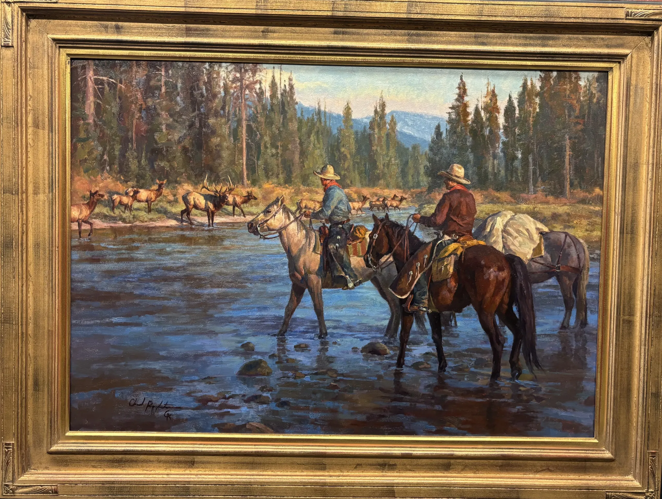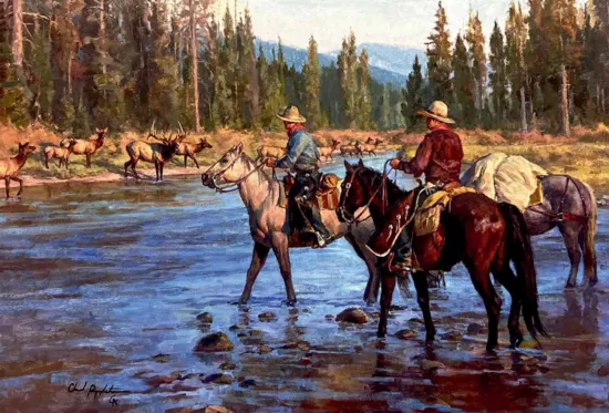 After a long day in the saddle two cowboys are taking a break to water their horses where the river is wide and shallow. From the timber across the river they hear the bugle of a monarch bull elk as he gallantly guides his harem through the autumn willows on the opposite shoreline. The elk, with a mixture of curiosity and apprehension, start to scatter up the river to safer areas. Like any king this bull announces his disdain for the intrusion and will start again to work tirelessly regathering the herd. The helpless cowboys can only watch as one of natures' spectacles play out in front of them comfortably from their leather seats. No doubt the memory will ring in their ears for years to come. - Chad Poppleton