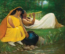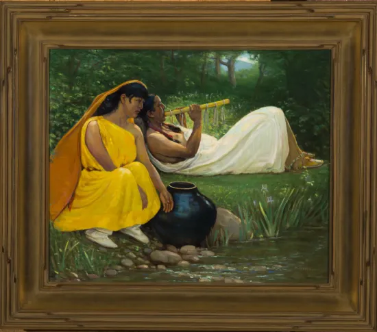 The Song of the Flute finds Taos Founder Bert Phillips in a pastoral mood. Taos was the equivalent of the mythical Greek land of Arcadia to Phillips; the native flutes were his pipes of Pan. Even the drapery on the figures–the flowing over-the-shoulder yellow dress on the woman and the billowing white robe on the man echo classical statuary. The sound of water in counterpoint with the music of the flute binds these people in this moment, with their surroundings. Look, for instance, at the way the woman listens and imagine how her hand feels against the cool earthenware water jar.