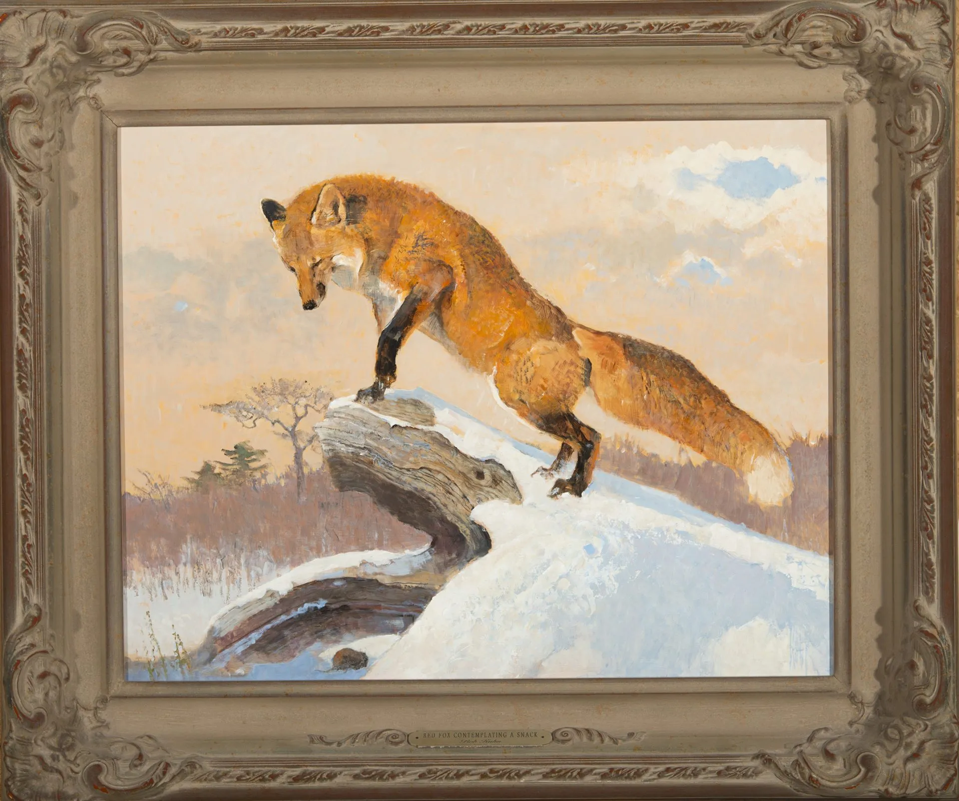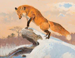 Classic Kuhn–like something out of Aesop’s Fables–the hungry fox and the mouse, who is either oblivious or entirely unworried. As ever, Kuhn captures the rough lushness of fox fur in winter and the essence of the imminent pounce in the fox’s raised left paw. Sunlight, which shoots through the clouds and shines on the snow, frames the mouse, who isn’t, in my mind, quite so unaware.