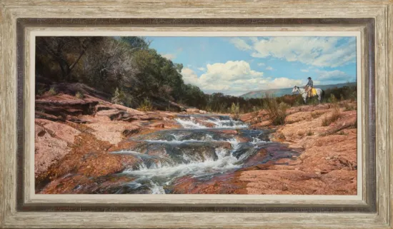 Though Bob Wygant began his career painting industrial scenes for Texas oil companies, as his fame grew he turned first to teaching and then, when the number of commissions he was receiving mounted, he left the university to paint full-time. Wygant takes a Texas approach to the Hudson River School, keeping his figures relatively small in gorgeous landscapes generally rendered in bright acrylics. In Recent Rain, Wygant gives the glory to nature as a new freshet washes down a staircase of red rocks.