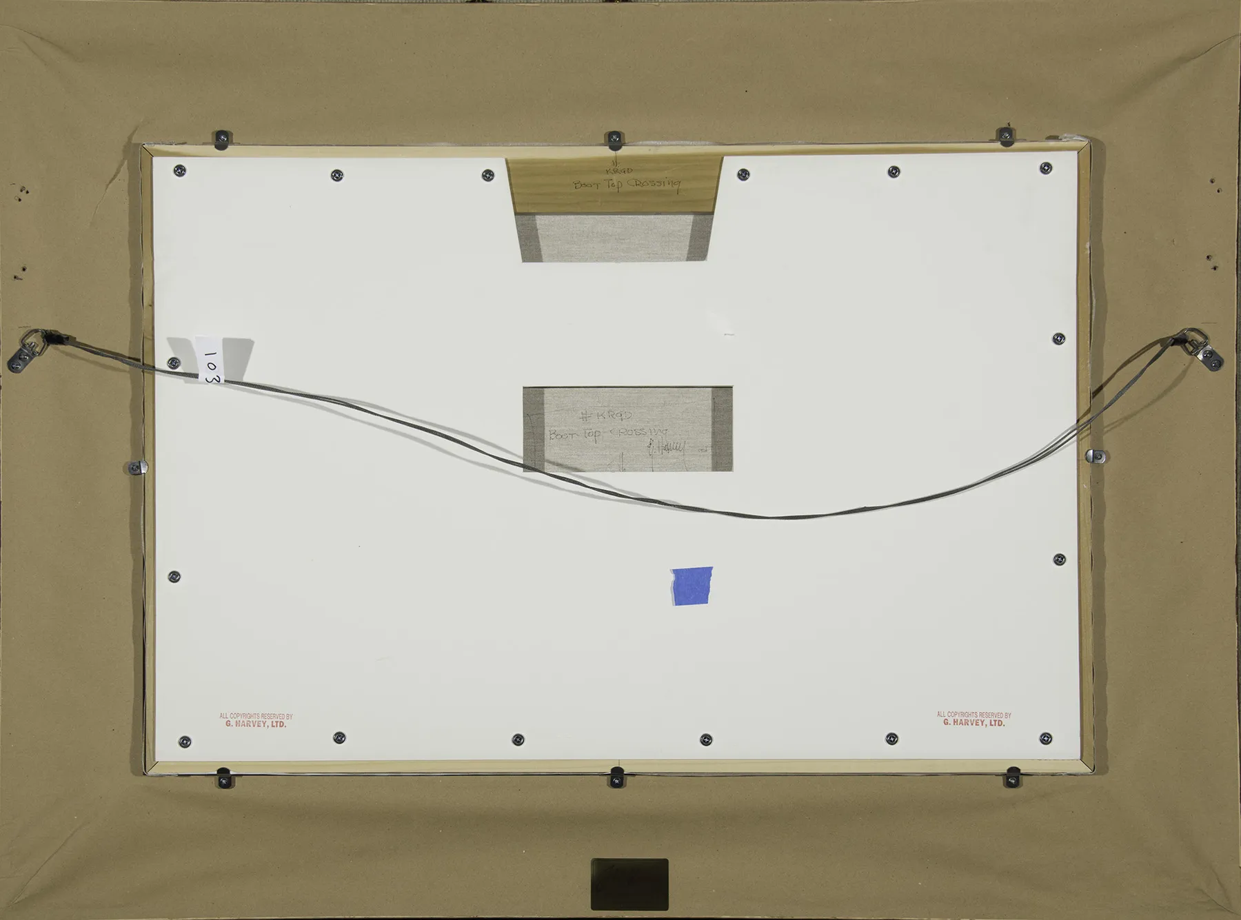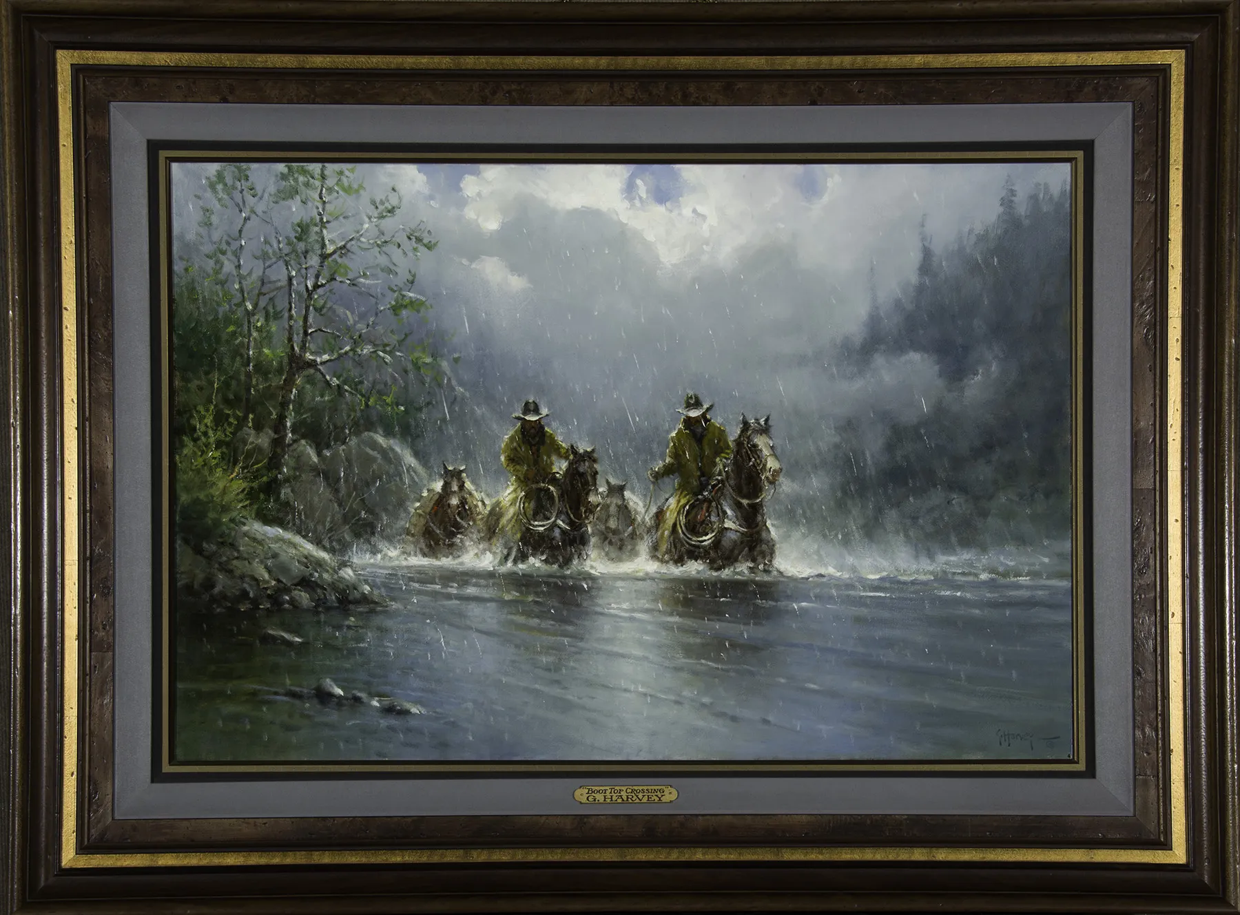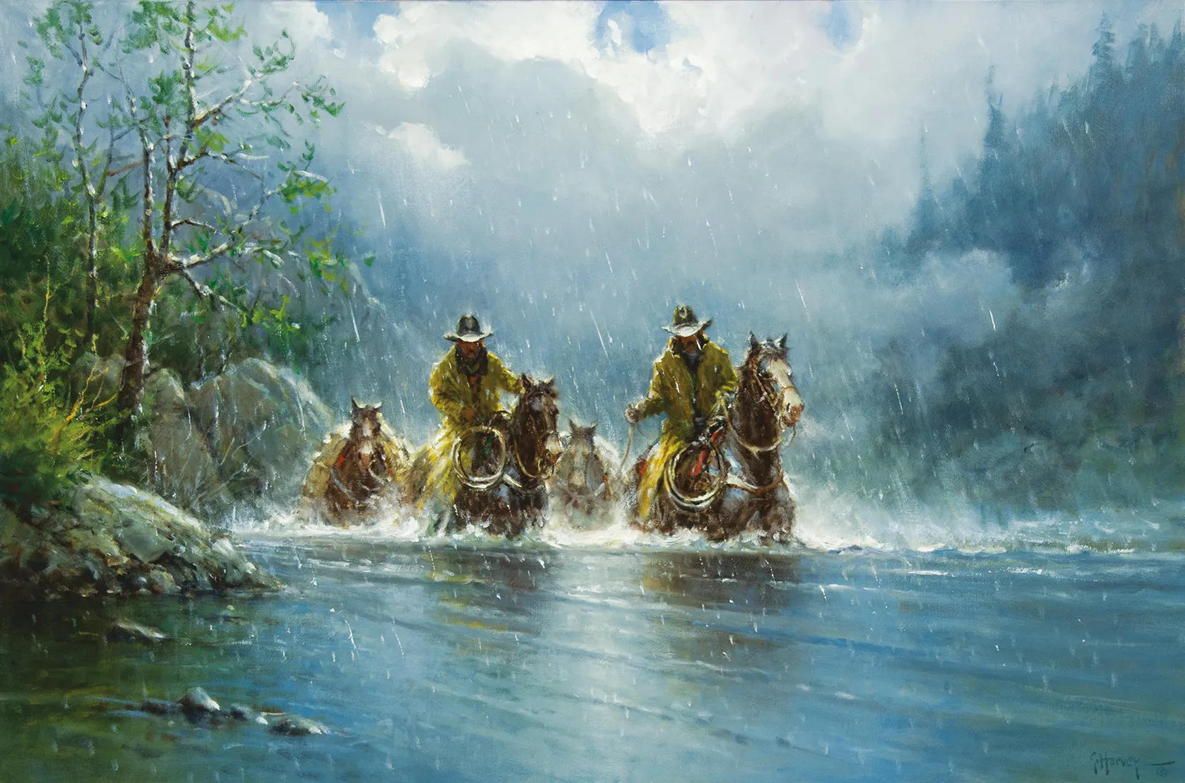 Traversing a flooded river during a rainstorm brings with it many risks and few rewards. Therein lies the drama of G. Harvey’s Boot Top Crossing, showing a pair of cowboys in yellow slickers riding through boot-high water pulling a pair of packhorses. The Texas artist painted the rain slicing downward at a slight angle, with droplets splashing off the riders’ waterlogged hats. Harvey’s grandfather was a trail boss at just 18 years old, so he grew up hearing stories of cattle drives, blistering summers, numbing winters and dangerous river crossings. The painting resembles Boot-Top Deep from 1982, which depicts an even more perilous crossing amid churning rapids and a torrential downpour. Boot Top Crossing, on the other hand, shows the resolve of the subjects—the looks on their faces suggest they already have the river beaten.