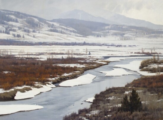 The location of the painting is in Buffalo Valley, WY, just east of Grand Teton National Park. This large studio painting was done using a 11" x 14" plein air study. About 30 minutes into the study, the artist was engulfed in huge flakes of the incoming snow storm and had to pack up in a hurry. He liked the view so much that he drove back to the location the next day to finish. Jay Moore knew he would have to paint this view on a monumental scale as he was standing there.