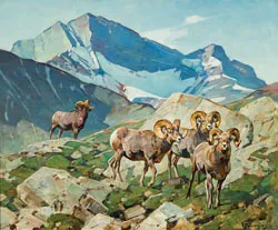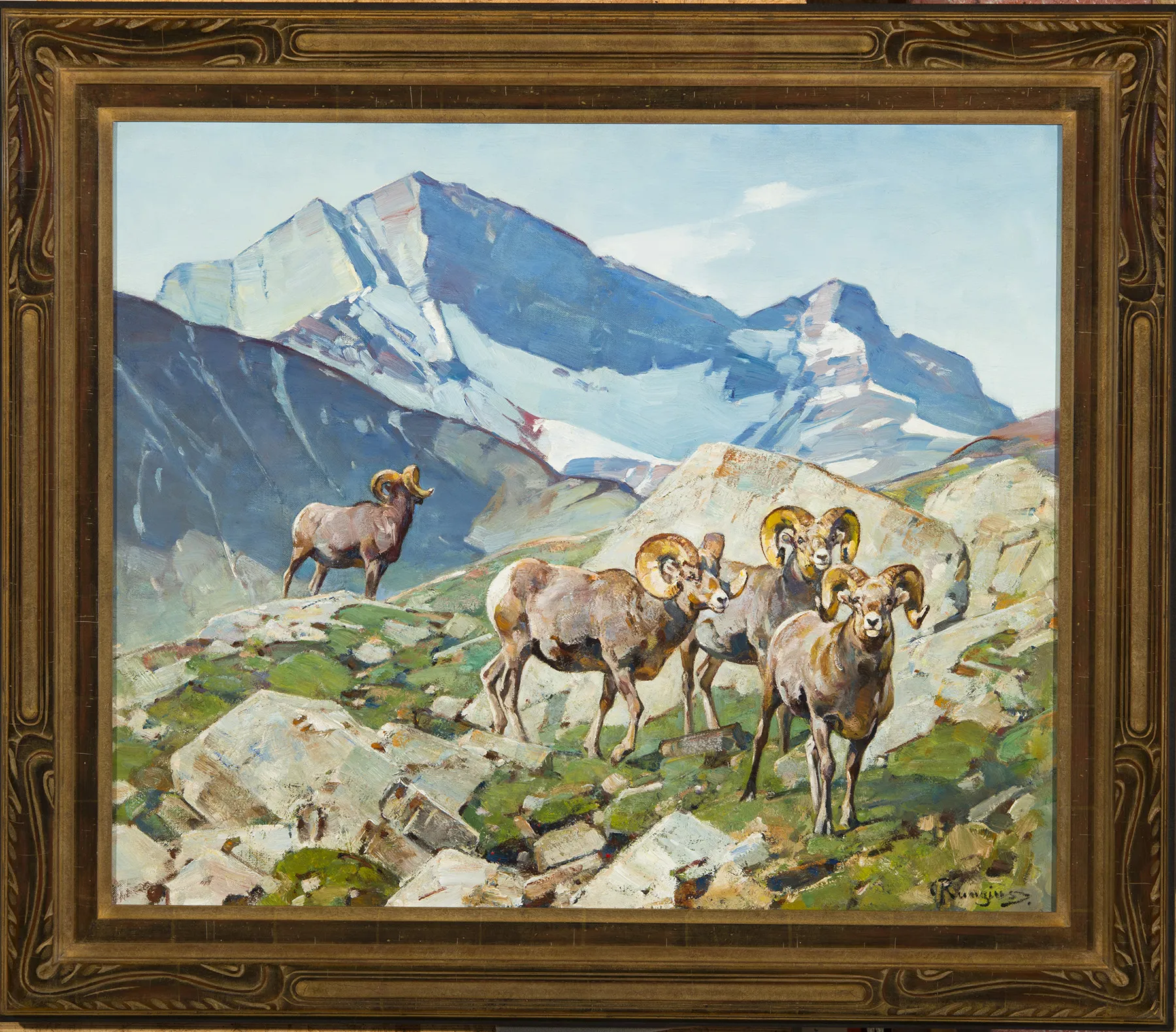 Carl Rungius left his home in Berlin in 1894 to come to the United States to roam, hunt and paint America’s big game animals. For the next fifty years, Rungius developed an expressive, dramatic approach to depicting America’s high country game animals on canvas, rooted in naturalism but not at all photographic. Rungius’s skills grew through his association with naturalists like Caspar Whitney and William Hornaday, the director of the New York Zoological Society (now the Bronx Zoo). His long trips to the Rockies, Alberta and the Yukon in the first decade of the 20th century gave rise to his signature style, a style on view in full flower in Old Men on the Ram River. As wonderful as the three curious Rocky Mountain Bighorn rams at lower right in the painting are, ambling down and toward the viewer–the two at right have noticed us already–it’s the ram at left, that wandering refusnik ovine looking back and up at the high peaks that really interests me. He seems like a stand-in for Rungius, Rungius the artist, standing a bit apart from the crowd, looking up at that trough in the mountains where the shadow falls, wondering what’s on the other side. Rungius does a wonderful job here, building the painting wide stroke by wide stroke, moving blocks of color through moss, rocks, and slopes, and getting the sheen on the coats just right.