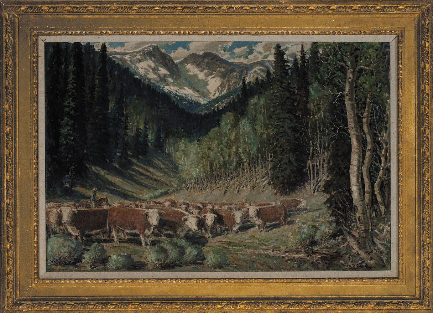 Please note that the first unframed photo is most accurate for color. Framed photographs are to show the frame and are not color corrected to the painting. *The Condition Reports are for guidance only and should not be relied upon as statements of fact, and do not constitute a representation, warranty, or assumption of liability by Scottsdale Art Auction. Scottsdale Art Auction strongly encourages in-person inspection of items by the bidder. All lots offered are sold “AS IS”. Please refer to item two in our terms and conditions for further information.