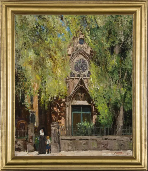 Fremont Ellis fell in love with the city of Santa Fe, New Mexico the minute he laid eyes upon it. He first traveled to the city in 1921 and later said that “it was the most beautiful place I’d ever seen.” Once in Santa Fe, Ellis formed the painting group La Cinco Pintores along with Jozef Bakos, Walter Mruk, Willard Nash and Wil Shuster, and Ellis was the youngest of the group. In Santa Fe, Ellis was moved by the landscape and unique pueblo architecture and there is nothing more iconic Santa Fe than the Loretto Chapel, located just steps away from the historic plaza on Old Santa Fe Trail. The Loretto Chapel was built in 1873 and it is the home of Santa Fe’s most famous relic, the Miraculous Staircase, built of wood with no glue, nails or other hardware. It is only fitting that Santa Fe’s most famous and well-respected artist would paint Santa Fe’s most famous and well-known architectural structure, The Loretto Chapel. This is the only known Ellis painting of the Loretto Chapel that has ever come to auction.