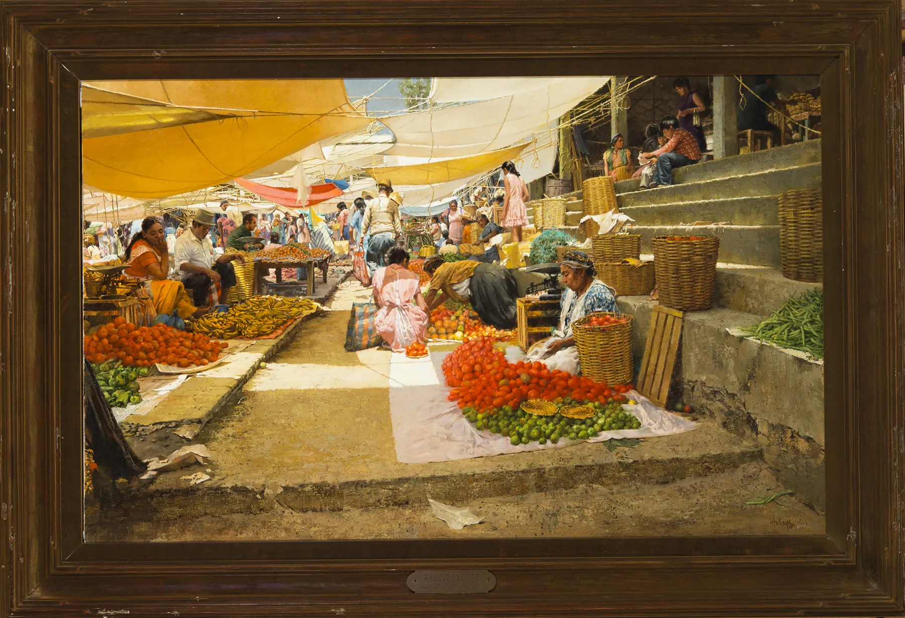 In his book, A Gallery of Paintings, Clark Hulings discusses Kaleidoscope: “Each vendor has two large canvas squares, one on which to sit and display wares, and one stretched overhead to provide protection from the sun. These vary in color. Onto this pattern of slanted checkerboards appear the vendors with their piles of fruit and vegetables and a stream of shoppers milling up and down the narrow aisles, judging quality and price, sometimes squatting down to buy. I spent a couple of hours watching the constant change of shapes and colors, likening the scene to a kaleidoscope, the hollow tube containing mirrors and colored glass chips which, when rotated, produces an effect similar to the one before me. So I chose the name Kaleidoscope for my unfinished picture. Once this idea was fixed, planning the picture was great fun. It became a matter of juggling shapes and patches of awnings and sunshine, of adjusting values of bright light, solid shadow and filtered light. Finally, I distributed the ‘chips’ of color–the reds, blues, greens, yellows, pinks, oranges and hues in between–doing all these things to move the viewer’s eye and make my “kaleidoscope” rotate.”