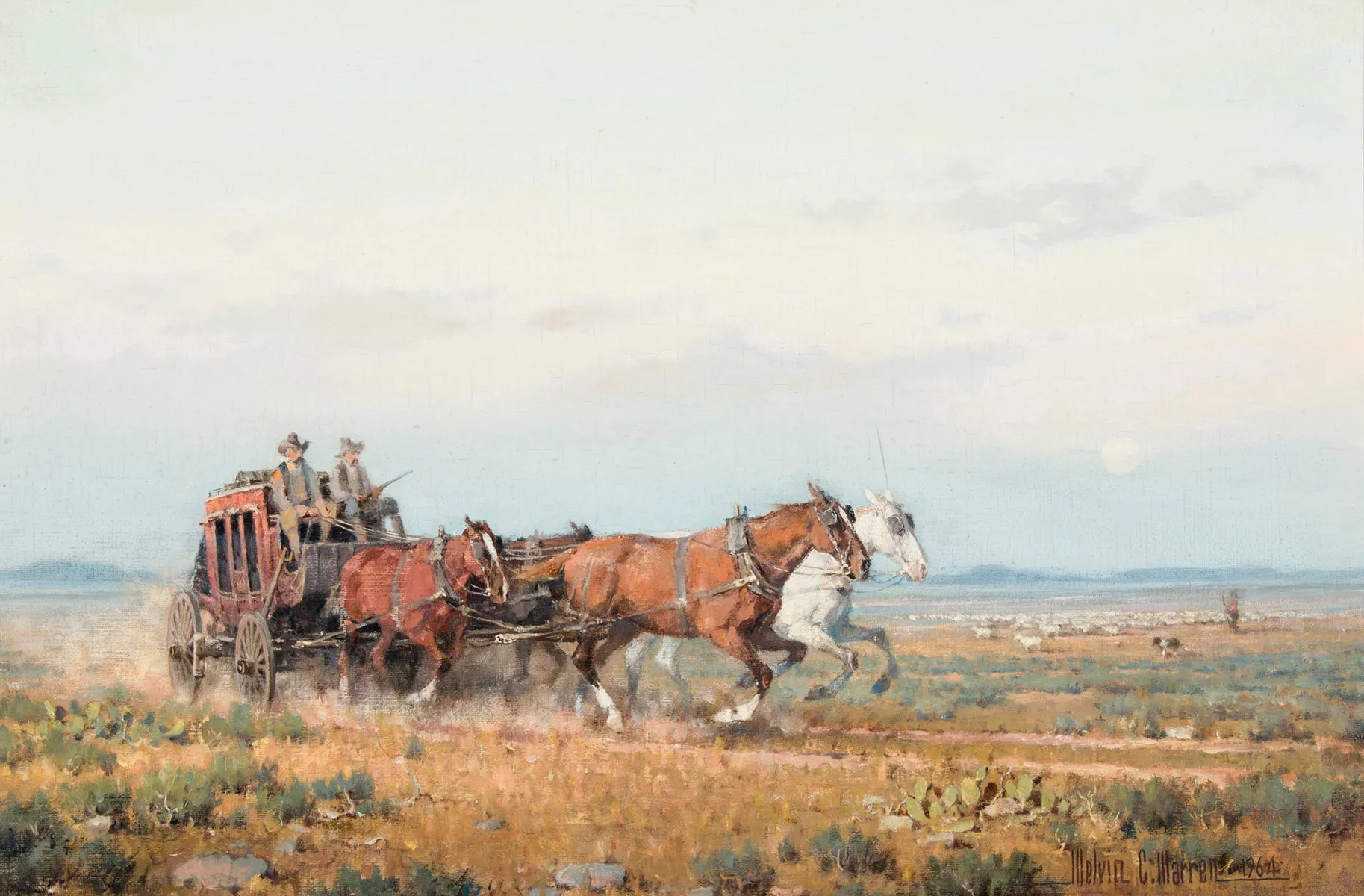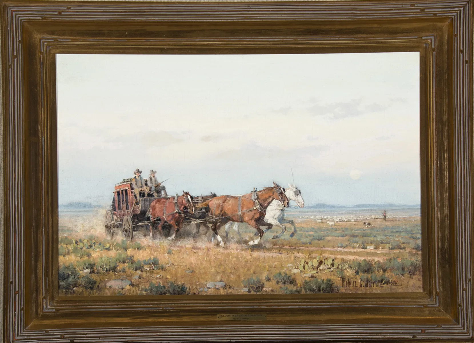 Melvin Warren was born in California but grew up on ranches in Arizona and New Mexico, before moving with his family to Texas at age fourteen. Warren served in the Air Force during World War II and received a fine art degree from Texas Christian University upon his return. While his desire was to be a full-time easel painter and sculptor, he worked as an illustrator early in his career in order to support his family, while creating his own work at night. By the early 1960s, Warren achieved sufficient success as a fine artist that he was able to leave the commercial art field. Warren joined the Cowboy Artists of America in 1968 and won the Memorial Award in his first exhibition with the CAA. President Lyndon B. Johnson was an avid collector of Warren's work, as was former Texas Governor John Connally Jr.