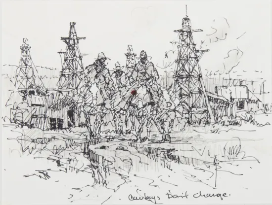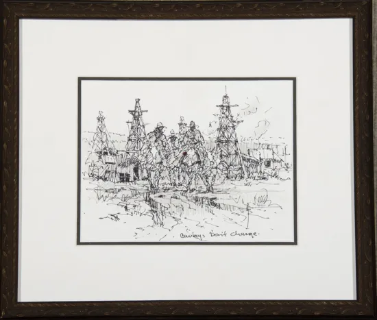 G. Harvey famously stated "My paintings have never been literal representations. They are part first-hand experience, and part dreams generated by those early stories I heard. They are a product of every place I have been, everything I have ever seen and heard." As Harvey believed his paintings represented personal connections to places and things, this exemplifies why his studies and drawings were so important to his creative process. According to Tim Taylor, Harvey’s son-in-law, every single painting he would do would have seven to ten iterations to it, from pen and ink to watercolor to quick oil sketch to final painting. It is in these studies where Harvey sets in place his emotion connections and feelings for his subject matter and it is in these studies where Harvey would figure out his compositional and color approaches for each work. In fact, one of the sketches consigned has a red dot in the image which represent the point of perspective he had determined for that particular work of art.