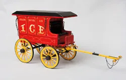 A full-time artist for over 40 years, Dale Ford specialized in scale model horse drawn wagons and stagecoaches. Made by hand of hand-rubbed hardwood, steel and leather, each component of each of these unique pieces is separately painted and detailed. The result of a combination of thorough research and artistry, Ford’s wagons and coaches offer a fascinating glimpse into a colorful aspect of a bygone era. The five wagons offered here are an excellent cross section of the conveyances that moved goods throughout the American West. They include an Overland Freight Wagon, Express, Fuel, Ice and Beer Wagons. The C. M. Russell Museum in Great Falls and Rich Harvest Farms in Chicago have extensive selections of Ford’s superb model wagons.