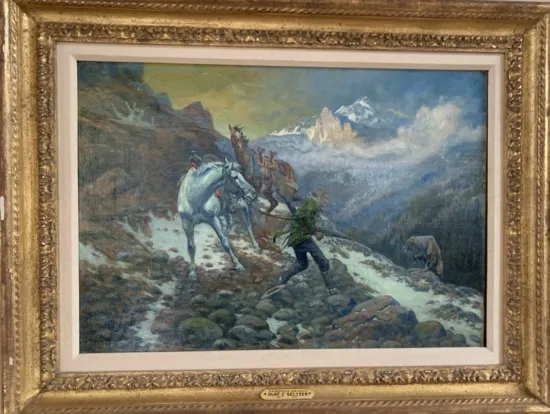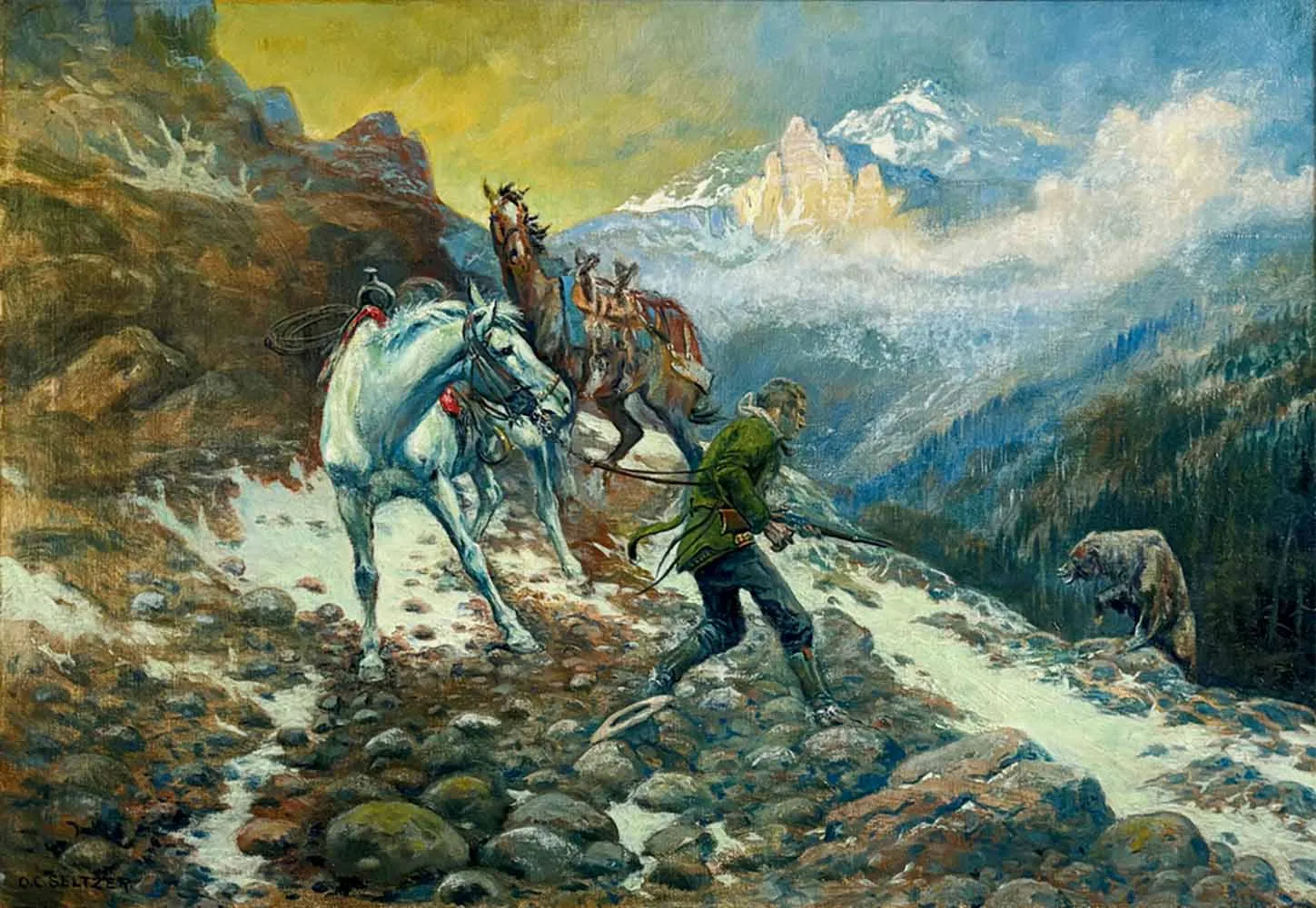 Danish-born painter Olaf C. Selter arrived in America at just 14 years. Within weeks of landing on American shores, he was in Montana with his family. First working as a cowboy, Seltzer later found employment with the Great Northern Railway as a machinist and repairman. It was in Great Falls where he met Charles M. Russell and many of Russell’s prominent collectors, who took an immediate liking to the younger artist’s works. In addition to his cowboy and Native American paintings, Seltzer was also fond of hunting and adventure scenes, as seen here in Dangerous Grizzly.