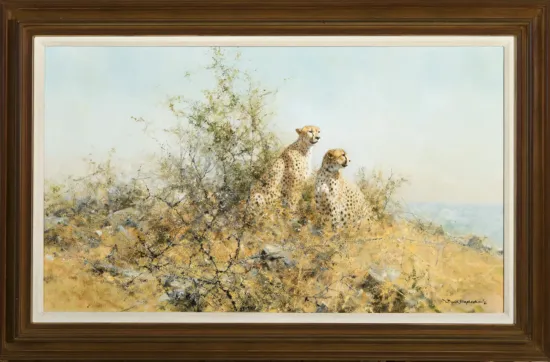 With its thorny impastos and the suggestion of a majestic vista, Two Cheetahs presents David Shepherd in his prime. From their hilltop vantage, the lithe cats–restless, even at rest–survey their world. Shepherd throws a romantic haze over the scene but lights the pair in an almost heroic way.