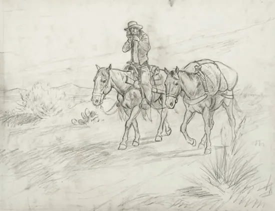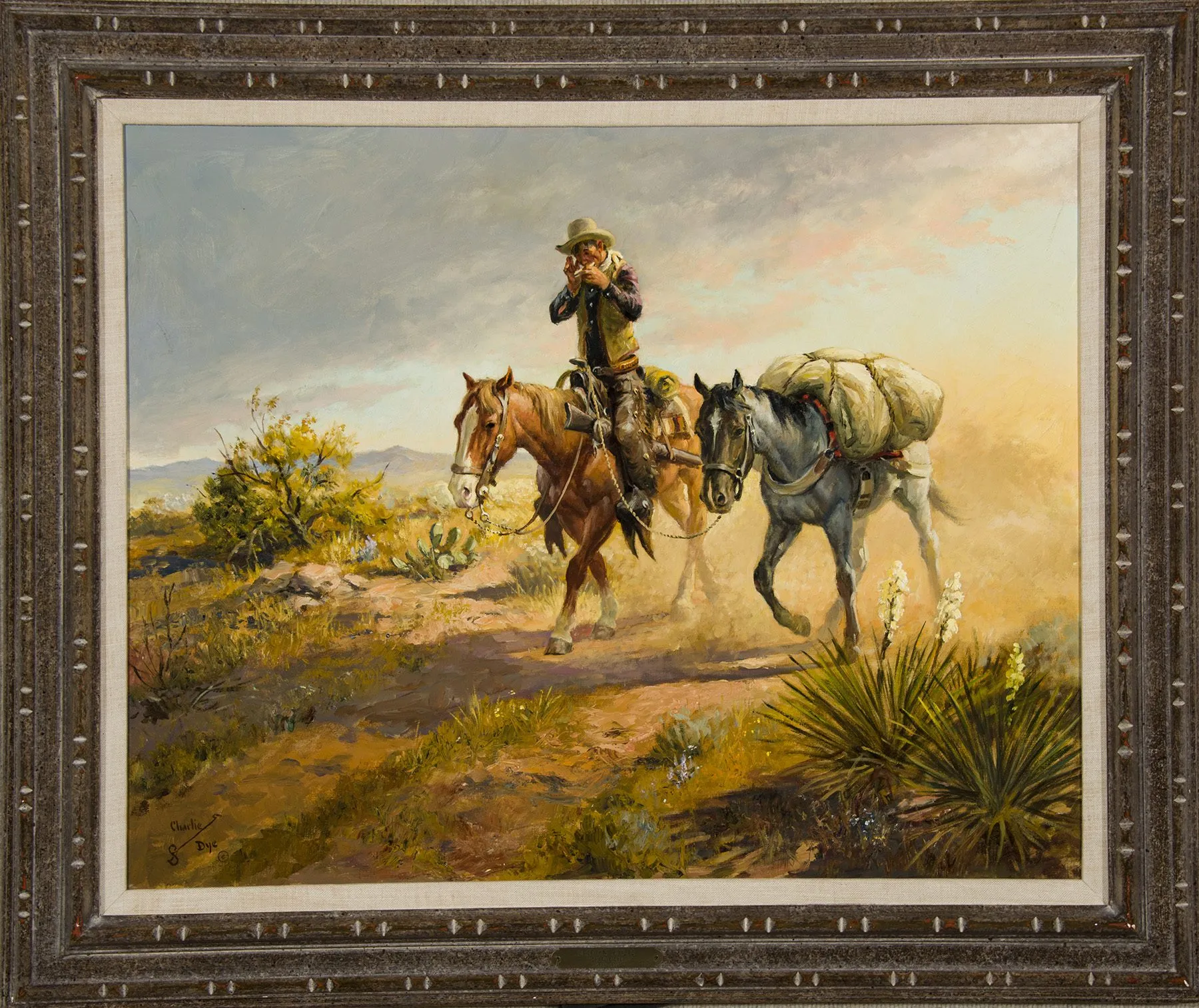 Raised around ranches, Charlie Dye was a cowboy before he was an artist. But when art called to him, he answered by studying in Chicago and working as an illustrator in New York City. He did interior images and covers for Argosy, Outdoor Life, American Weekly, Family Weekly, Saturday Evening Post and many others before he packed up and headed west to paint cowboys. In Sedona, he met Joe Beeler and the rest, including the formation of the Cowboy Artists of America, is history. Driftin’ Music, created during a peak period in 1963, is listed as painting number 116 of 257 in the artist’s journals, some of which are reproduced in the book Charlie Dye: One helluva western painter.