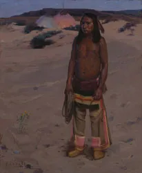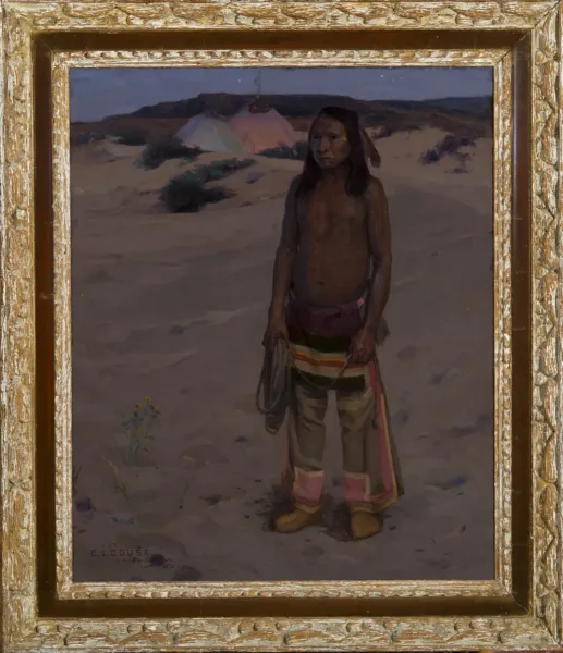 After studying in France with William Adolphe Bouguereau, among others, E. I. Couse settled in New York City but built a summer studio in Arlington, Oregon, on the Walker Ranch owned by the family of his wife, Virginia Walker Couse. Arlington sits just across the Columbia River from Washington State. Couse painted there from 1896-98, but was frustrated by the reluctance of the Native Americans there to pose for him. The local peoples–Yakima, Cayuse, Umatilla, and Klickitat–were nomadic and superstitious about allowing their likenesses to be taken by the artist. The model for this painting is not known, but he appears in a number of Couse’s canvases from this period. With the tipis tucked into the sand dunes at upper left, and the stars suggesting the onset of night, Couse is experimenting with light and color. These forays into the nocturne provided the foundation for his celebrated night scenes in Taos.