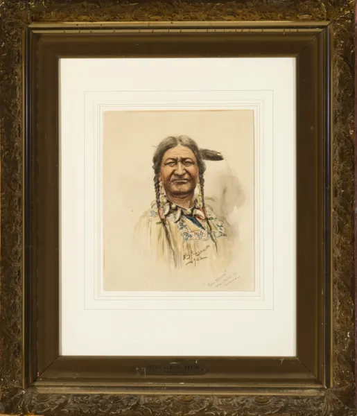 Paxson has the right war chief, Two Moons (though he forgot the s), but he has the wrong tribe. Two Moons was Cheyenne, not Crow. We can perhaps forgive the artist. He must have been fairly excited in 1902 to be painting one of the great Indian leaders, a celebrated warrior at the Battle of the Little Bighorn as well as at the Rosebud and Wolf Mountain. After his surrender, Two Moons scouted for the officer who had defeated him, General Nelson Miles, and eventually became head Chief of the Cheyenne Northern Reservation. In addition to posing for Paxson and other artists, Two Moons was one of Fraser’s models for the Indian Head/Buffalo nickel.