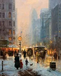 The Empire State Building towers in the orange haze on this winter evening, so we know we’re looking at a New York City scene sometime after 1931. From 5th Avenue, because the Empire State Building is on the right, we appear to be looking downtown from somewhere near the New York Public Library. The clock, one of many similar elegant clocks in Manhattan, tells us that it’s just past 4:30, early dusk, December perhaps. Families of tourists and residents, kids with their mothers, workers headed home, create the bustle of the afternoon rush. The carriage drivers wait for fares. In Harvey’s Evening on the Avenue-New York, 5th Avenue, it’s a pretty evening for hiring a carriage and taking a ride past all the lit up shops and restaurants, a pretty evening for people watching, which is exactly what we are doing when we look at this painting.