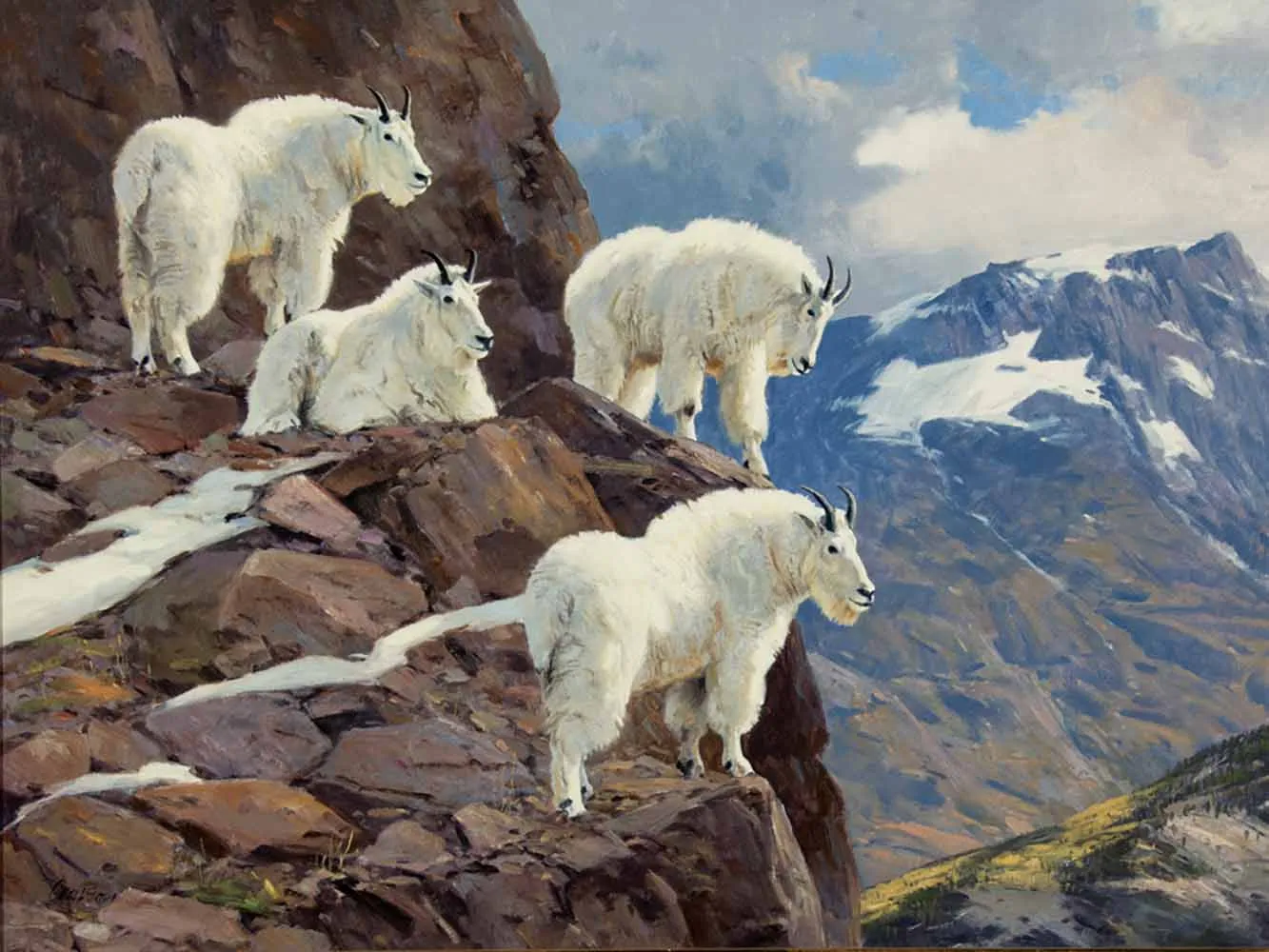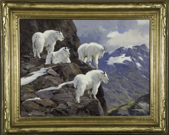 Texas-based painter Ken Carlson paints most of the large North American mammals from his Kerrville studio. These include bears, moose, elk, wolves, bison, pronghorn and whitetail deer. He reserves a special place on his easel for images showing bighorn sheep and, as seen here in Four Gentlemen, mountain goats. The majestic mammals, with their small horns and sure footing, cut distinct silhouettes perched amid rocky outcroppings high up in Grand Teton or Yellowstone national parks, as well as other destinations where Carlson finds his inspiration. The animals have been the subjects of many of the master wildlife painters, including Bob Kuhn, Carl Rungius and John Clymer.