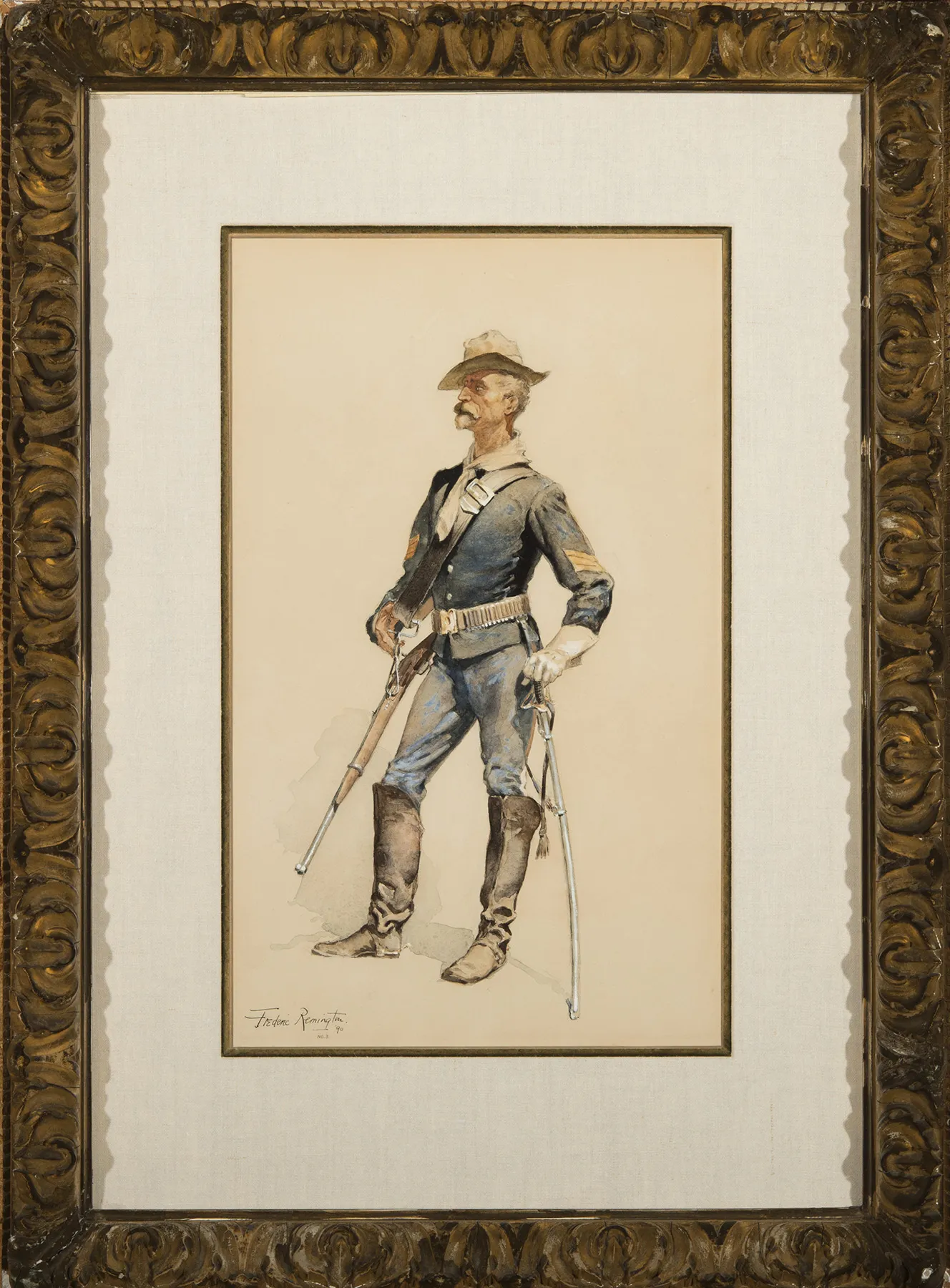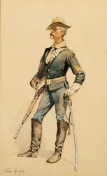 A Typical Trooper accompanies Major G.W. Baird’s spirited account of General Miles’ command in various Indian campaigns from 1874-1890. What is interesting is that, on reading the essay, one gathers that the trooper’s life–and dress–were rarely, if ever, typical. From the drought of the plains in western Kansas, to the battles with Crazy Horse through a Montana winter, to the desert heat of Arizona and northern Mexico in pursuit of Geronimo, troopers marched in their underwear or in thick furs. Baird recounts the conflict between cultures with an evenhandedness that is rare for its time, giving voice to the justice of Native resistance and scorning the mistreatment of Indians by whites. He finds much to admire in the Native American way of war–and of life–even as he sees their subjugation to “civilization” as inevitable. Baird singles out Chief Joseph and the Nez Perce for particular praise. A Typical Trooper is Remington’s everyday U.S. Army hero, the bold, brave soldier who does his duty with attitude, here depicted in the pugnaciously jutted chin, magnificent whiskers, and jaunty stance.