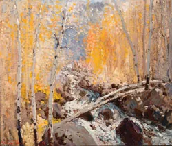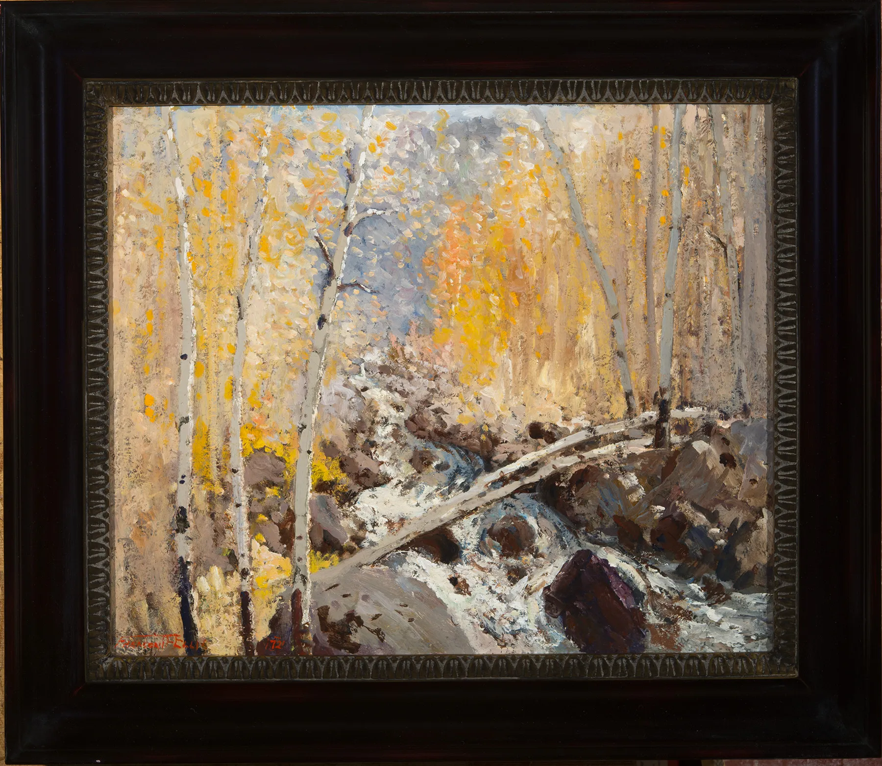 You can imagine, and almost see, Fremont Ellis’s brush, in his hand, pushing paint around to create sensations of color, light and texture rather than line and shape. The best known of Los Cincos Pintores–Santa Fe’s answer to the Taos Founders–Ellis was virtually self-taught–he had been an optometrist and photographer, occupations that influenced his artistic vision–and had a reputation as a loner among the typically gregarious New Mexico artists. Santa Isabella Creek is a model of Ellis’s romantic, electric vision. Fall yellow aspens shimmer in the sun, flanking the creek as it tumbles from one current-rounded boulder to another. The fallen aspen bridges the two stands of trees, suggesting the passage of time, and the passage from one season and state of being to another.
