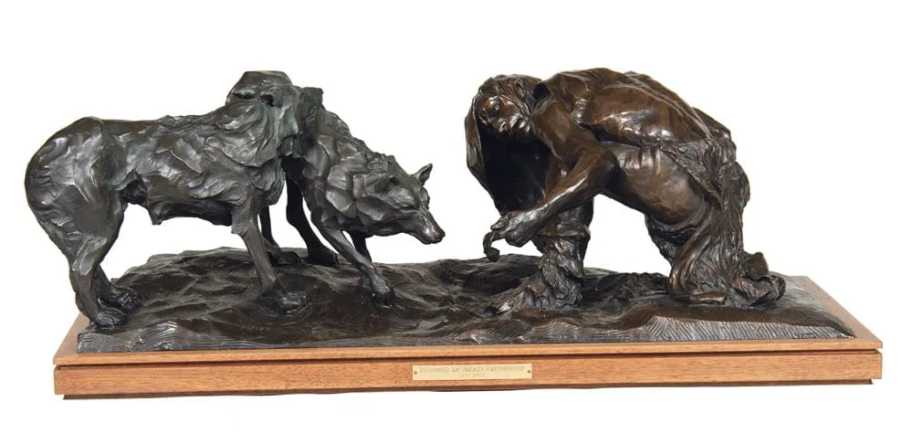 Indian artifacts he found beside the Little Miami River in Ohio kindled Fritz White’s interest in the traditions and beliefs of Native Americans. White felt the presence of the past, what he called the saga of the American Indian. As a consequence he studied voraciously. This passion for research permeates his art, and earned him membership in the Cowboy Artists of America in 1972.