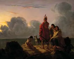 Residing in Troy, New York, it is thought that Sarah Huntington Whitlock painted in the 1850’s and 1860’s. It’s impossible to know whether Frost Comes is Whitlock’s original title, but the work has come to bear the same additional title as a major canvas by John Mix Stanley—The Last of their Race—as if to draw a comparison between this painting and Stanley’s masterpiece. Artists of the period often saw the plight of Native Americans as a Shakespearean tragedy filled with the kind of pathos in Whitlock’s painting where an American Indian family weeps beside the shore, pushed to the literal brink. The sun sets. Turbulent clouds obscure the horizon, the future. The dog looks to the red-robed chief who looks down and offers no comfort. Two young women are in tears, while the eldest woman looks back, anxiously. Always in this kind of mythical tale, there is a classical stoicism in their suffering, something you see in Roman renderings of the vanquished Gauls. Frost Comes is a remarkable painting painted by a remarkable woman at a time when women did not paint heroic oils.
