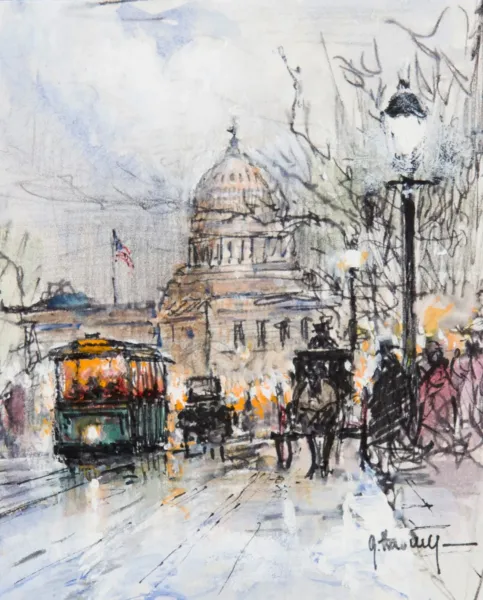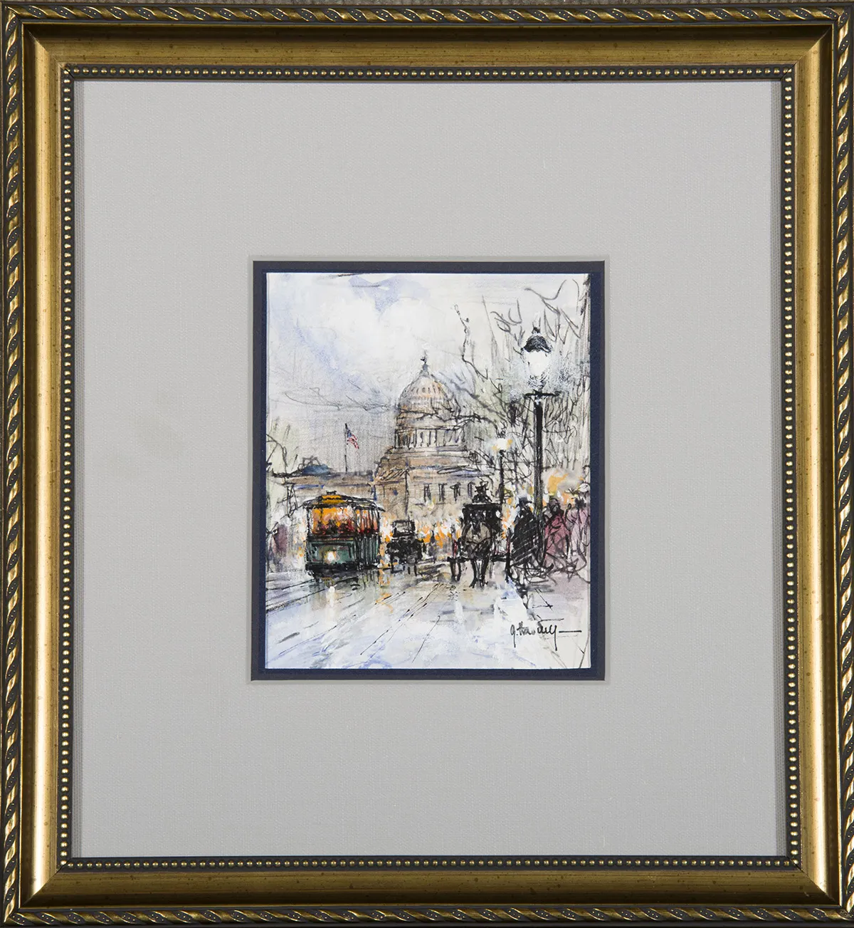 G. Harvey famously stated "My paintings have never been literal representations. They are part first-hand experience, and part dreams generated by those early stories I heard. They are a product of every place I have been, everything I have ever seen and heard." As Harvey believed his paintings represented personal connections to places and things, this exemplifies why his studies and drawings were so important to his creative process. According to Tim Taylor, Harvey’s son-in-law, every single painting he would do would have seven to ten iterations to it, from pen and ink to watercolor to quick oil sketch to final painting. It is in these studies where Harvey sets in place his emotion connections and feelings for his subject matter and it is in these studies where Harvey would figure out his compositional and color approaches for each work. In fact, one of the sketches consigned has a red dot in the image which represent the point of perspective he had determined for that particular work of art.
