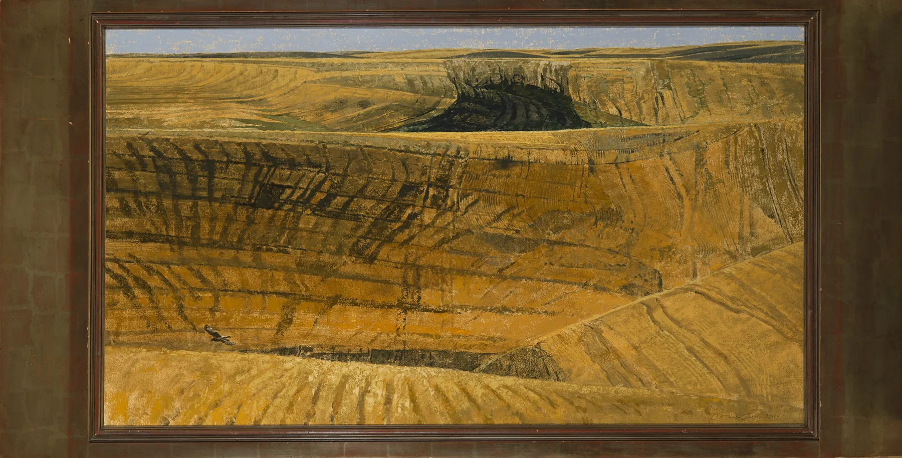The title character in George Carlson’s magnificent yet lapidary oil, The Silent Hunter, is the eagle gliding at lower left, just over the lip of the crater. But the scoring, as if by giant claws, tells another story. The craters suggest ancient meteors or extinct volcano chimneys, or the kinds of scars human beings leave behind on the face of the earth. Each fissure, then, is like a wrinkle on an old face, a product of time, of history, a chapter in an old story of wear and tear and erosion, of cataclysms and periods of relative peace. Perhaps time is the true silent hunter here (after all, the eagle cries), the one that creeps up on all of us in the geological blink of our lives on this planet.