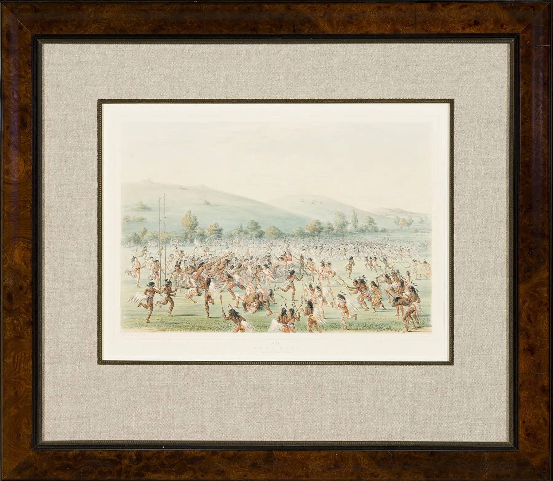 George Catlin was the first white man to meet and paint American Indians in their environs, on their terms. In five separate journeys in the years 1830-36, Catlin traveled widely, painting portraits, hunts, ceremonies, and games among the Ojibwa, Menominee, Sauk, Mandan, Sioux, Osage, Seminole, Cherokee, and many other tribes. His works toured the United States and Europe and the widely broadcast books and prints that illuminated his adventures highlighted the plight of the Indians and took some steam out of the prevailing fiction that Native Americans were noble savages who would inevitably be sacrificed to progress.