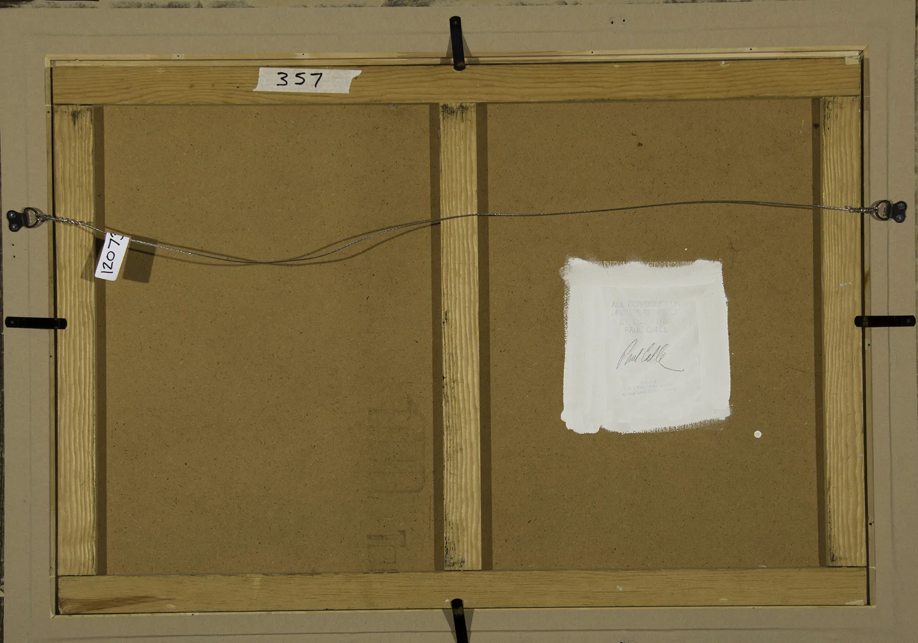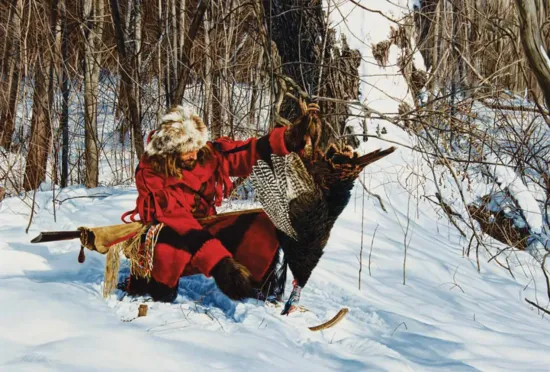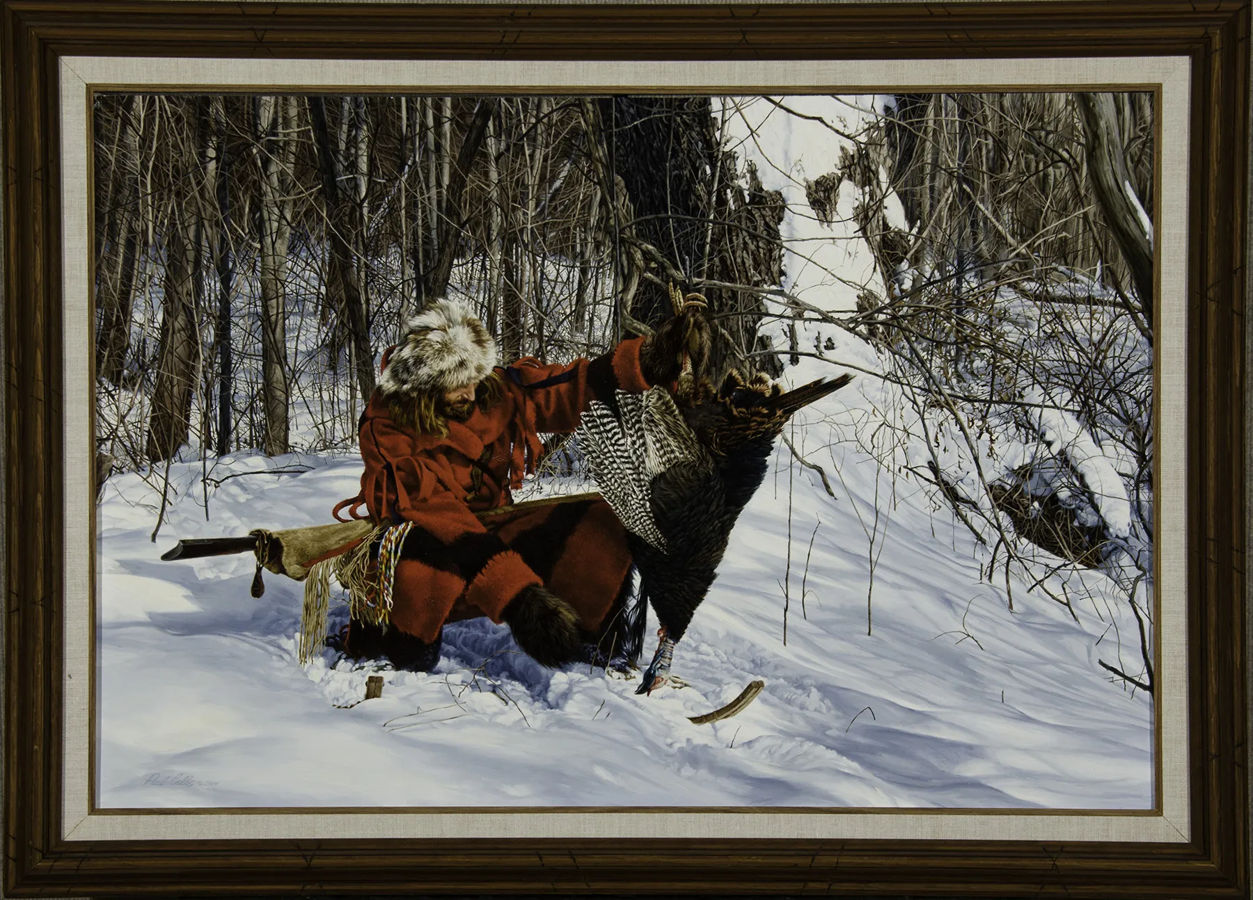 Respected in the West for his artwork of trappers, Paul Calle is known to the larger public as the NASA artist who documented the 1969 Apollo mission that would land humans on the moon. Calle was the only artist in the room as Apollo 11 astronauts Neil Armstrong, Buzz Aldrin and Michael Collins prepared for their historic trip into space, and those early sketches informed a whole portfolio of NASA images, including some of the most reproduced stamps ever released by the United States Postal Service. In 1973, Calle turned his attention to the West, where he painted adventure scenes of Native Americans and early American explorers and trappers. Good Hunting shows one of Calle’s most iconic subjects, a trapper identifiable by his red coat fashioned from a Hudson Bay blanket.