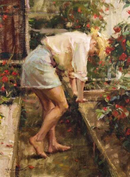 Please note that the first unframed photo is most accurate for color. Framed photographs are to show the frame and are not color corrected to the painting.