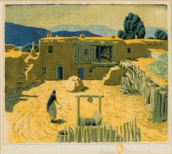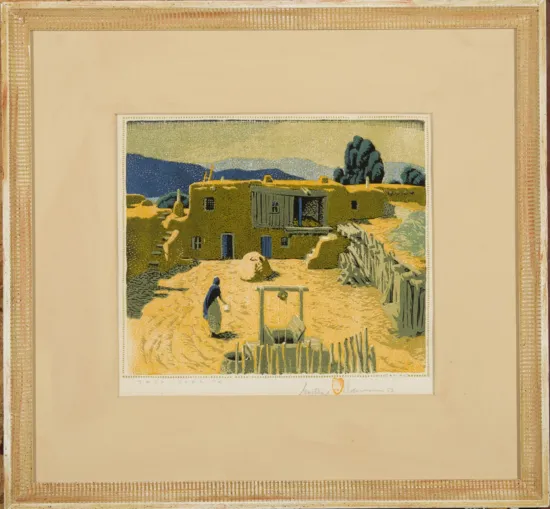 Gustave Baumann developed his interest in color woodblock printmaking as part of the Brown County Art Colony in Indiana and moved to the Southwest in 1918, first to Taos and then to a permanent residence in Santa Fe. Baumann’s work expresses his enthusiasm for the people, flora and fauna, and archaeology. Rooted in Arts and Crafts aesthetics, but with a modernist sensibility, Baumann’s bold colors and textured forms echo in expressionistic ways. Baumann also carved marionettes for public ceremonies (including Zozobra, precursor to today’s Burning Man) and figures for churches.