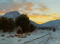 Hamilton Hamilton was of Scottish ancestry, though he was born in England. When he was young, his parents emigrated to the United States and settled near Norwalk, Connecticut. His parents did not at first share his interest in art, though they did come round and help send him to Europe to study in 1870. After two years he returned home and opened a studio. The following year, 1873, Hamilton traveled to Colorado to sketch and paint. The works he produced there and thereafter brought him his greatest fame when some were selected for the 1876 Centennial Exhibition in Philadelphia. Hamilton continued to travel widely, eventually opening a studio in New York where he befriended Moran, Chase, and other American artists. The story in Winter Camp is deceptively simple. After your eye follows the track that leads to the man turning out the horses, you take in the second man who sets up the tent and gets the fire going in the shelter of the trees. Just a sliver of a waning crescent moon shines in the clearing clouds of the late light sky. As usual with Hamilton’s work, it’s all about the pink and lemon light, the purples and dark greens. This luminous scene spites winter, and is wholly benevolent.