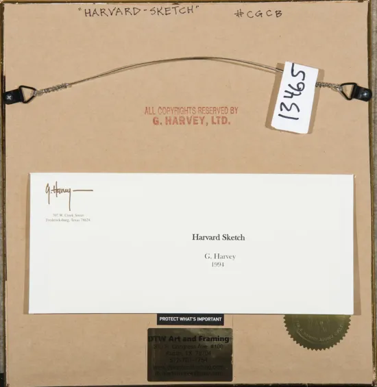 We are quite fortunate to bring to market an extensive collection of Harvey’s studies and drawings consigned directly from the Harvey estate. Since Harvey was very protective of these early steps in his artistic process, some of these are being seen for the first time. In these works of art, one can see all of the Harvey subject matter that he is so famous for and the very things he references in the above quote drawn from his grandfather’s stories of ranch life---lonesome cowboys, rural churches, rustic buildings, street scenes and quiet winter mornings. Along with these classic images, there are some unusual subjects as well, including A View Over the Kremlin Wall and the Harvard Bookstore. Over the Kremlin wall is a completed painting done by Harvey from his hotel room in Moscow before the fall of the wall.