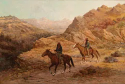Henry Raschen may have the distinction of being one of the first California artists to make Native Americans his principal subject. Born in Germany, Raschen emigrated with his family in 1868. He studied in San Francisco, finished his training in Munich, then returned to California. Raschen roamed the state, living among and painting various tribes. Scouting Party is an excellent example of his work, demonstrating his attention, not only to the figures, but also to the rugged landscape. Raschen accompanied General Miles on the expedition that led to the capture of Geronimo and gained acclaim through the patronage of Phoebe Hearst, mother of news magnate William Randolph Hearst.