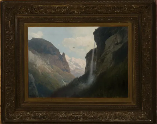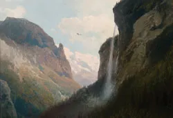 Like Albert Bierstadt, Herman Herzog’s training at the art academy in Dusseldorf led him to paint sweeping Romantic landscapes with vertiginous cataracts and storm shrouded peaks. However, the external turmoil in Herzog’s conceptions of Nature describes a duality, a Manichean yin and yang battle between darkness and light–the beautiful and the sublime–in the universe. You can see the dichotomy at play here: the foreground, at right, is sublime, shadowed and eerie, while the thin stream of the falls seems to descend from another realm. At right, the sun moves from cool to bright where an eagle soars in the dazzle.