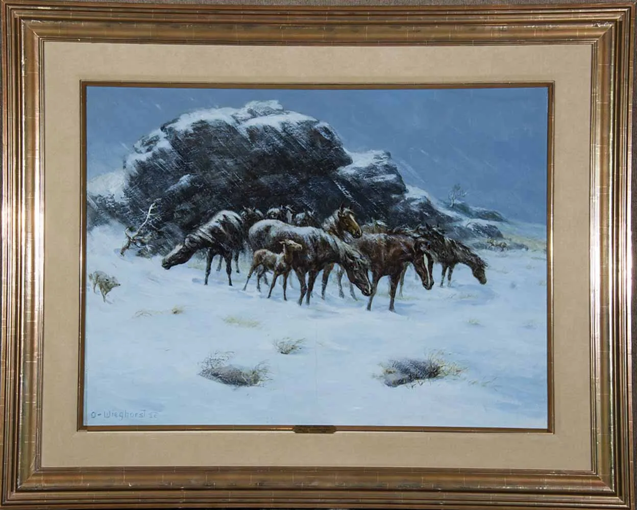 No subject intrigued Olaf Wieghorst more than the horse. “I’ve been observing horses for so many years that I guess I’ve begun to think like one,” says in his book Olaf Wieghorst. “That’s what I mean when I say that the horse has been my greatest teacher. Horses have been my companions under nearly all possible conditions. I have frozen with them at night in sub-zero weather; ridden across the desert in some of the hottest days on record; starved with them and hunted water with them longer than I care to remember. I have nailed shoes onto hundreds of them; been kicked, bitten, squeezed, bucked off, stepped on by them, and fallen from them, but in spite of all the hurt and broken bones, I have no regrets. Any measure of success that I now enjoy, I owe to them. Horses have been my life!”