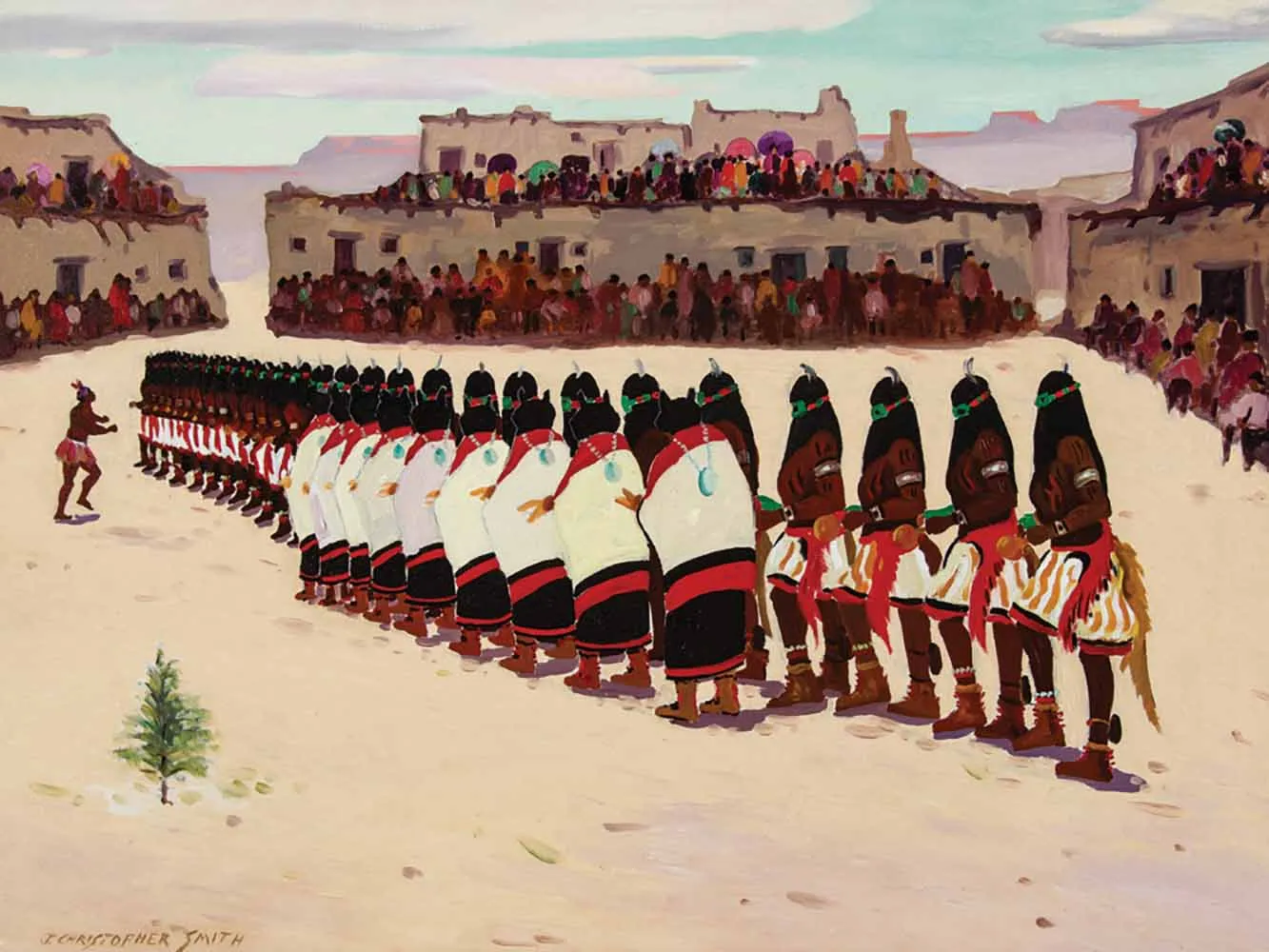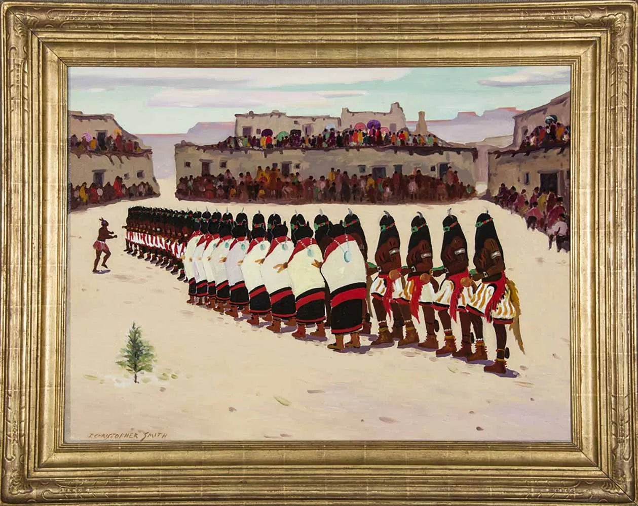 John Christopher Smith was born in Ireland, but only spent the first 12 years of his life there before making the pilgrimage to America with his family. He served in World War I, and after returning to the United States began to study art under Robert Henri, the Ashcan artist known for his great portraits. Smith was also close with painter Franz Bischoff. The two would travel through the West painting the land and its diverse residents. Smith was especially moved by the Pueblo People of New Mexico and Arizona. His work is quite varied: California landscapes, scenes of Los Angeles rail workers, farmers and homesteaders, coastal and marine paintings, florals and, to the delight of Western collectors, many beautiful images of Native American subjects under clear desert skies.