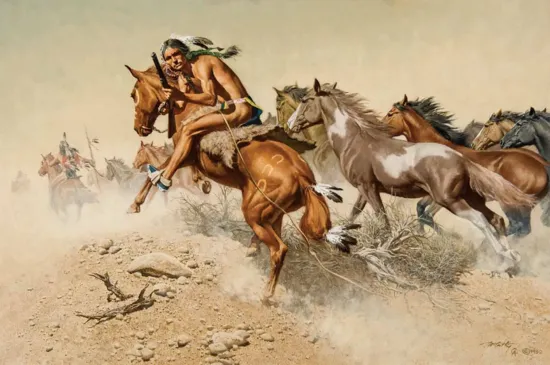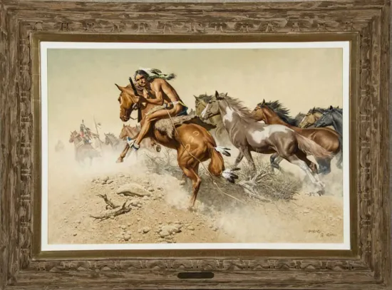 Frank McCarthy paintings are unions of action and detail. The action part can largely be traced back to his days as an illustrator, particularly his time painting images for Hollywood action movies, including the James Bond franchise. The detail came from his love of nature and how it interacted with light. “His paintings are realistic down to the finest particulars,” Elmer Kelton writes in The Art of Frank McCarthy. “He finds beauty in many things: the eroded, sometimes jagged, coarse rock; gnarled, bleached-out logs and stumps; the dirt and the sage; the play of light on muscles levering a carbine or wielding a war club; or a horse galloping full tilt…all this, and the many variations of light, shade and color.”