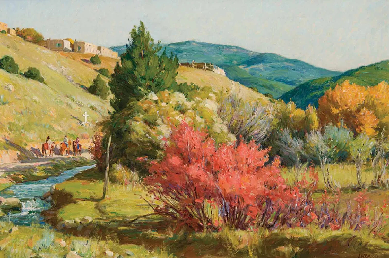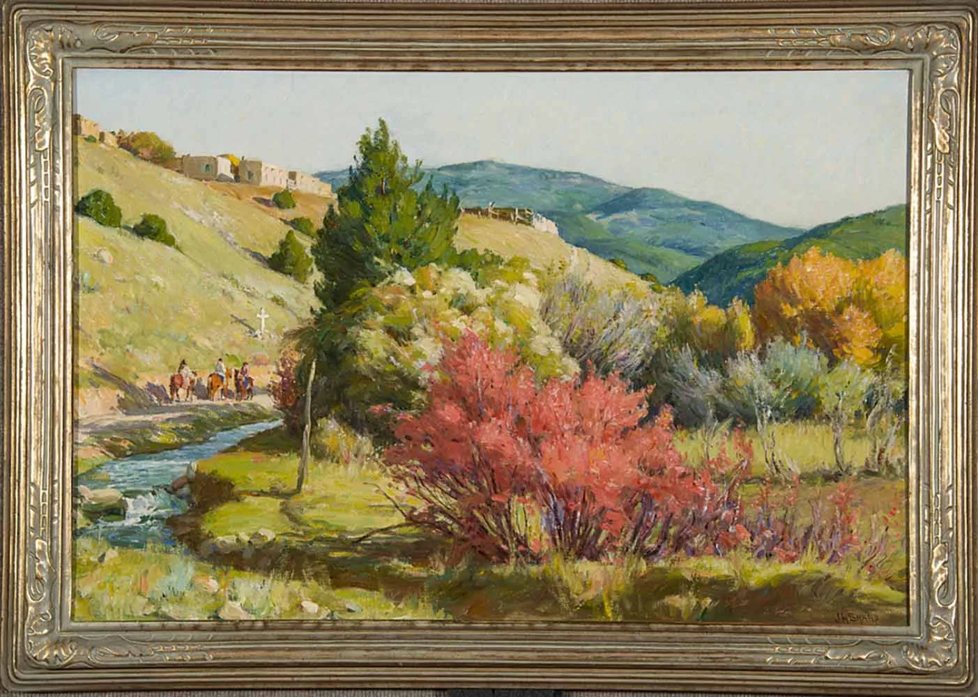 Houses Where the Penitentes Live features neither procession nor lashing, but rather a lovely landscape showing a bend in a stream as it turns through a small valley filled with a colorful arrangement of plant life. Three riders can be seen, as can a distant cluster of homes atop a hill. Only a small cross and its well-defined shadow indicate the religious nature of the painting’s setting or subjects.