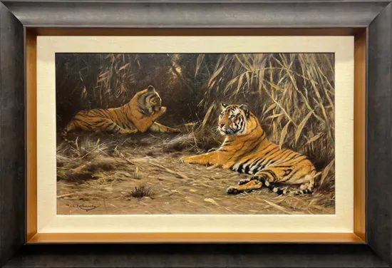 Although he was given the nickname Lion by fellow painters, Wilhelm Kuhnert also spent a great deal of time painting tigers, as he does here with In the Jungle – Tigers, which is listed as No. 4216 in the artist’s forthcoming catalogue raisonné. The German painter is part of wildlife art’s “Big Four,” which also includes Carl Rungius, Bruno Liljefors, and fellow German painter Richard Friese. “The work of these four artists established a vision of wildlife and wilderness that remains with us today and had a tremendous influence on wildlife artists of the 20th century,” says Adam Duncan Harris of the National Museum of Wildlife Art.