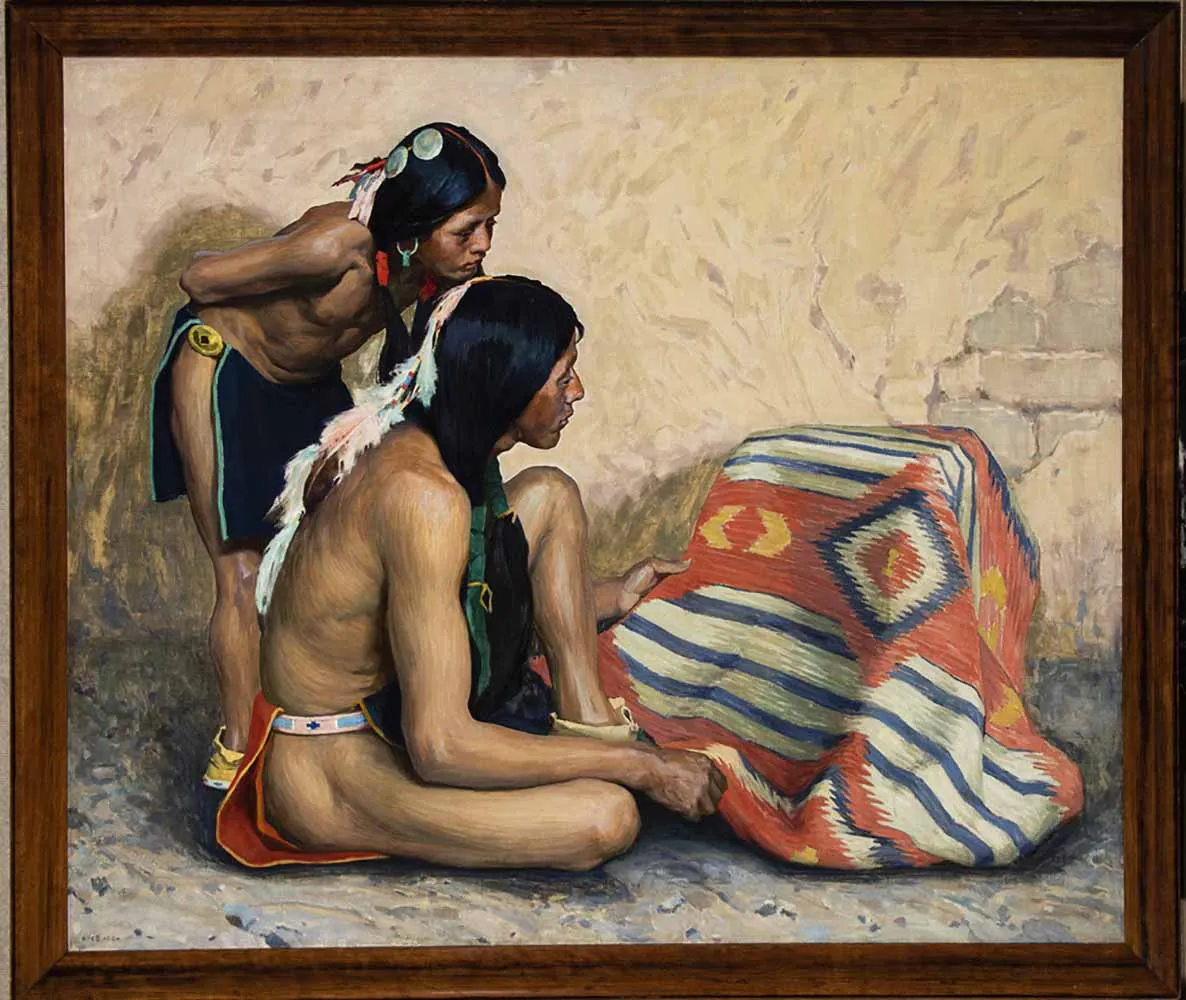 Eanger Irving Couse was known for a variety of work, including his lovely outdoor paintings showing idyllic nature scenes with Native American figures, and his iconic portraits, such as Elkfoot of the Taos Tribe, but some of his most timeless pieces are interior scenes of subjects carefully admiring objects and artifacts. A marvelous example of this work is Indian Boy and Brave Looking at a Blanket, a large painting showing two Taos models, their hair wrapped and dangling down both sides of their shoulders, as they peer down at a colorful weaving. The older subject—almost certainly Jerry Mirabel, a regular Couse model—cuts an imposing form with his strong arm at a right angle toward the blanket and one leg propped up against his body. Part still life, part portrait, Indian Boy and Brave Looking at a Blanket represents the kind of imagery the Taos Founders had to travel 2,000 miles to find.