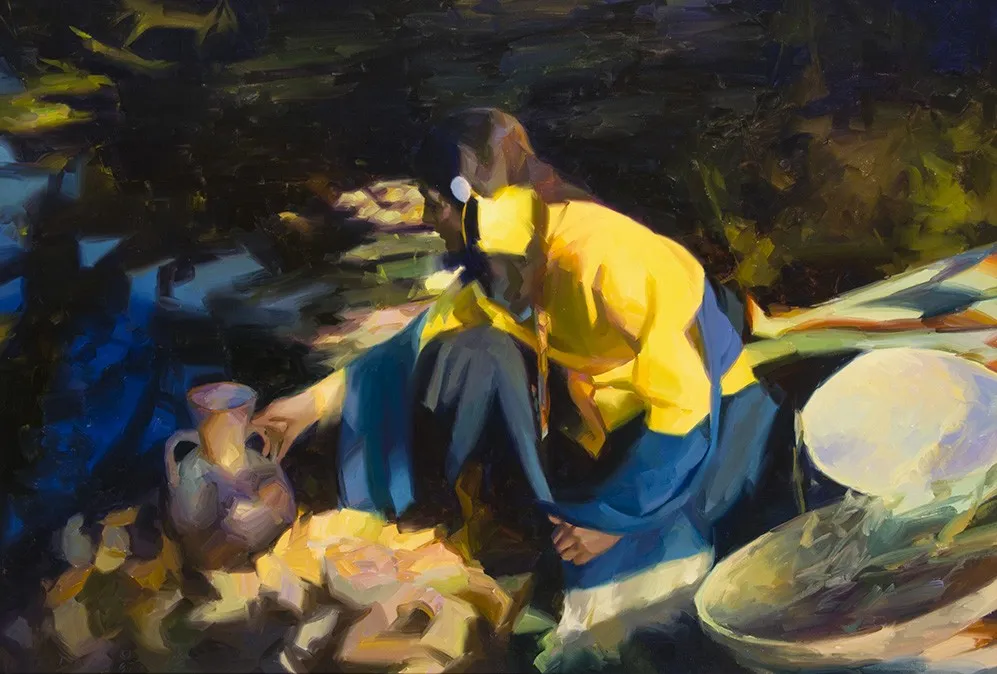 Indian Girl With Water Jug- Study In Yellow and Blue